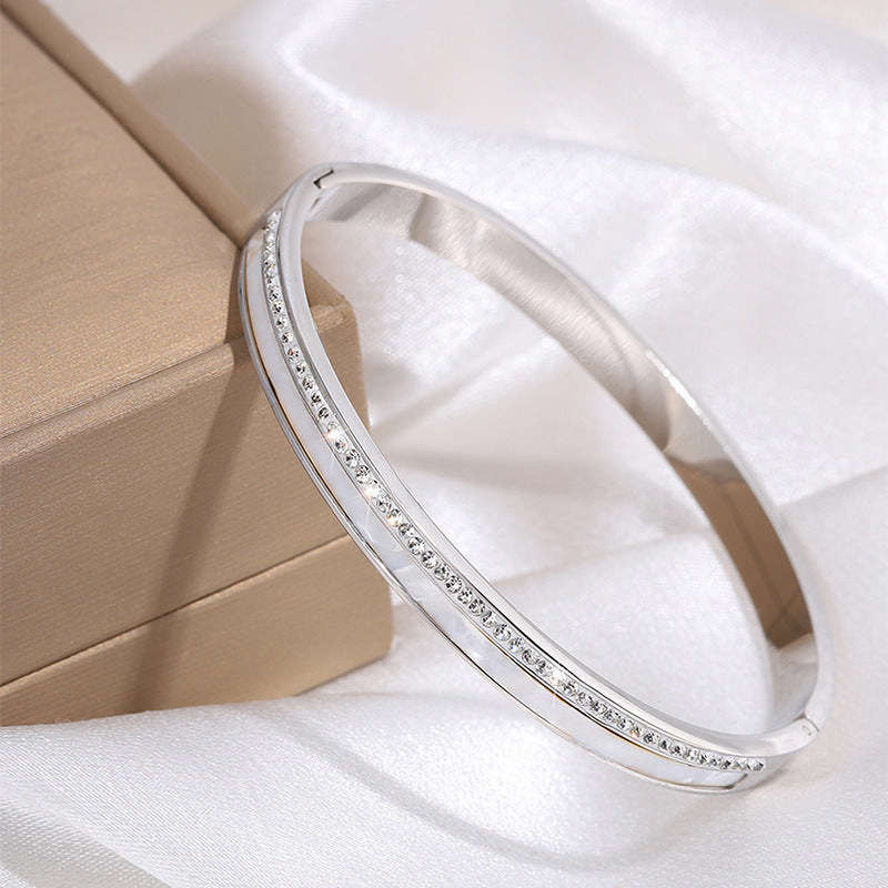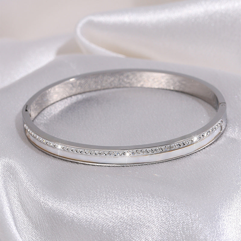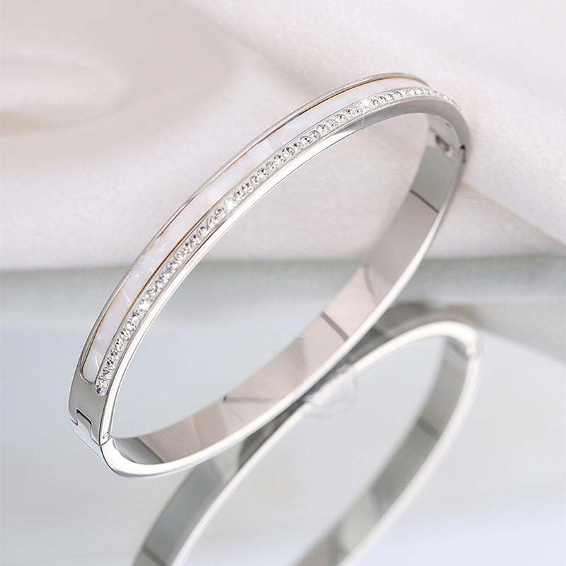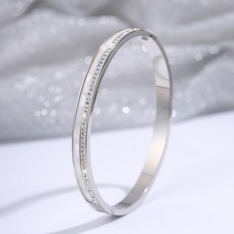新款貝殼排鑽開口不鏽鋼銀色手鐲高級女日韓清新鈦鋼手鐲百搭飾品