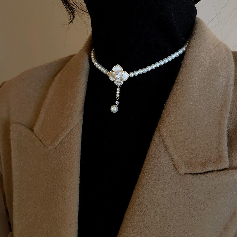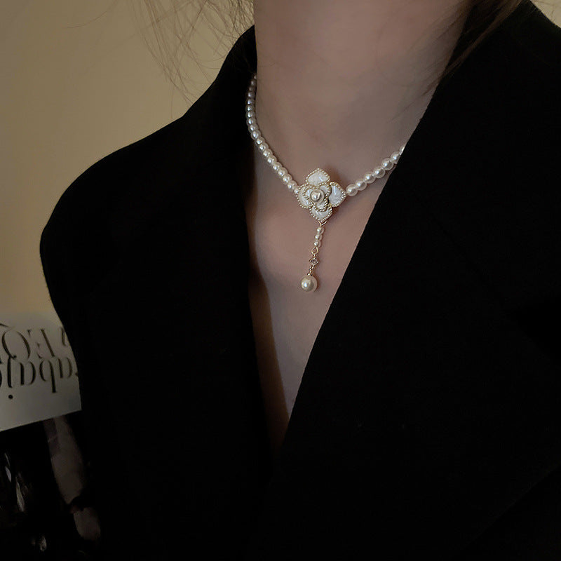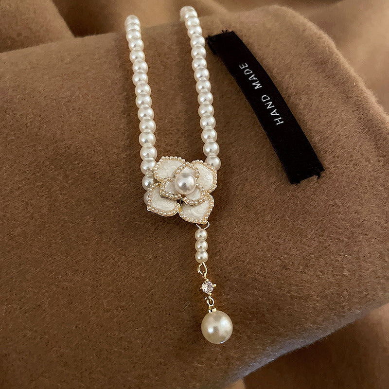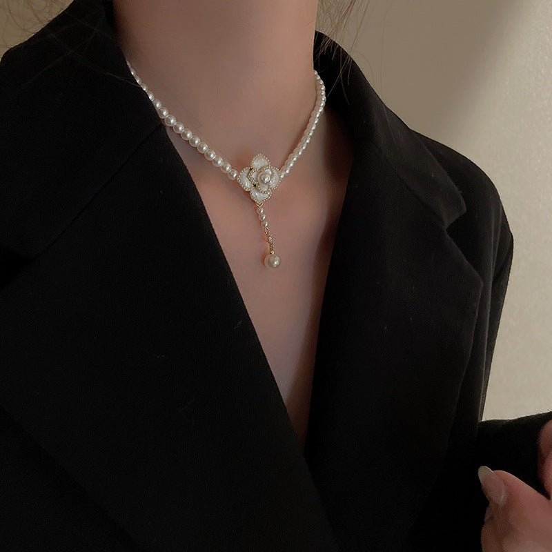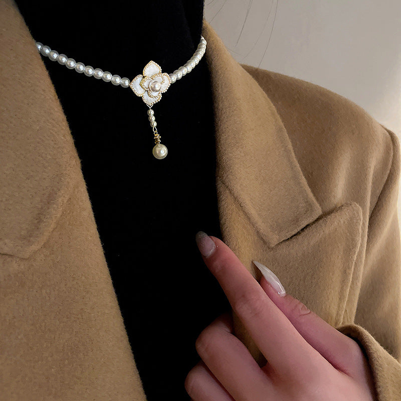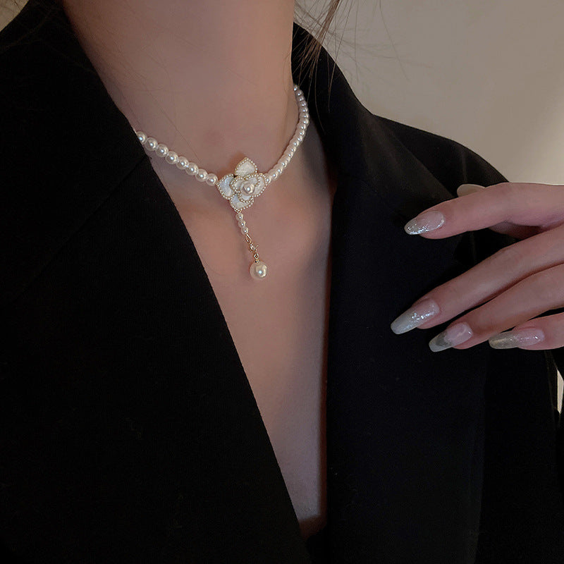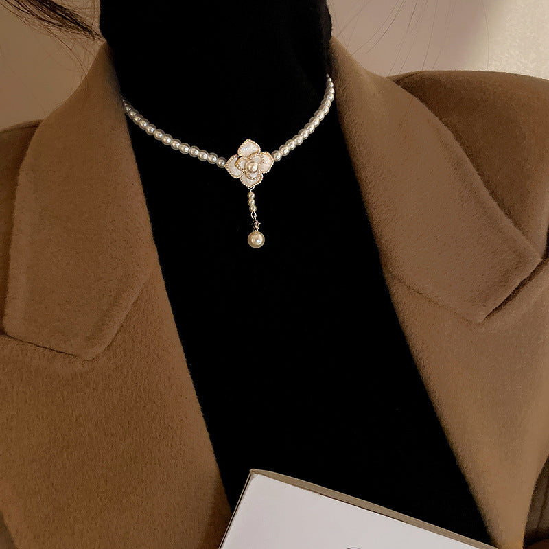 法式山茶花珍珠項鍊女小衆設計感鎖骨鏈時尚優雅潮流感輕奢項飾品