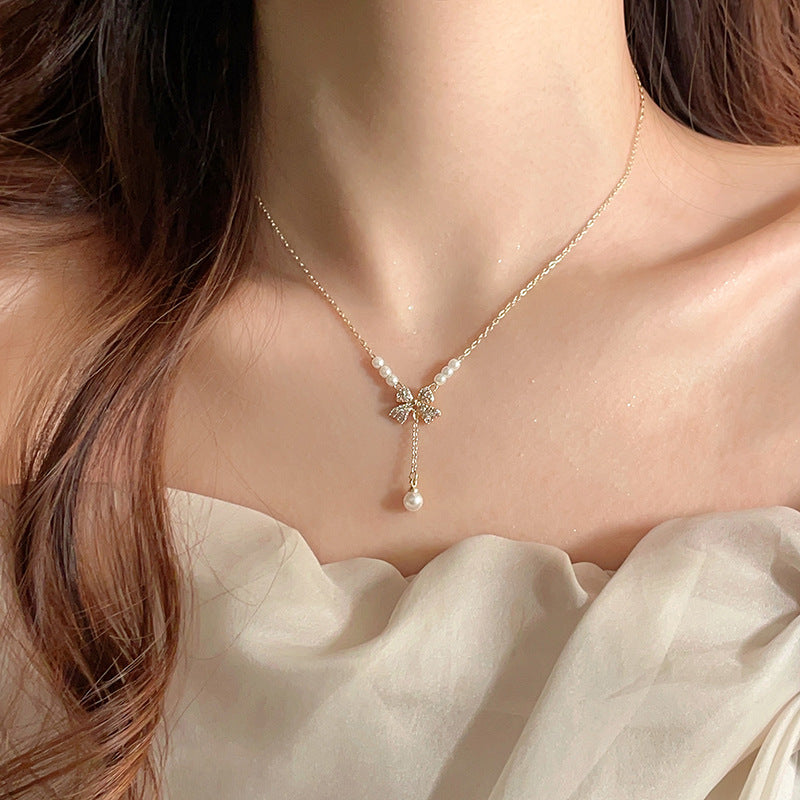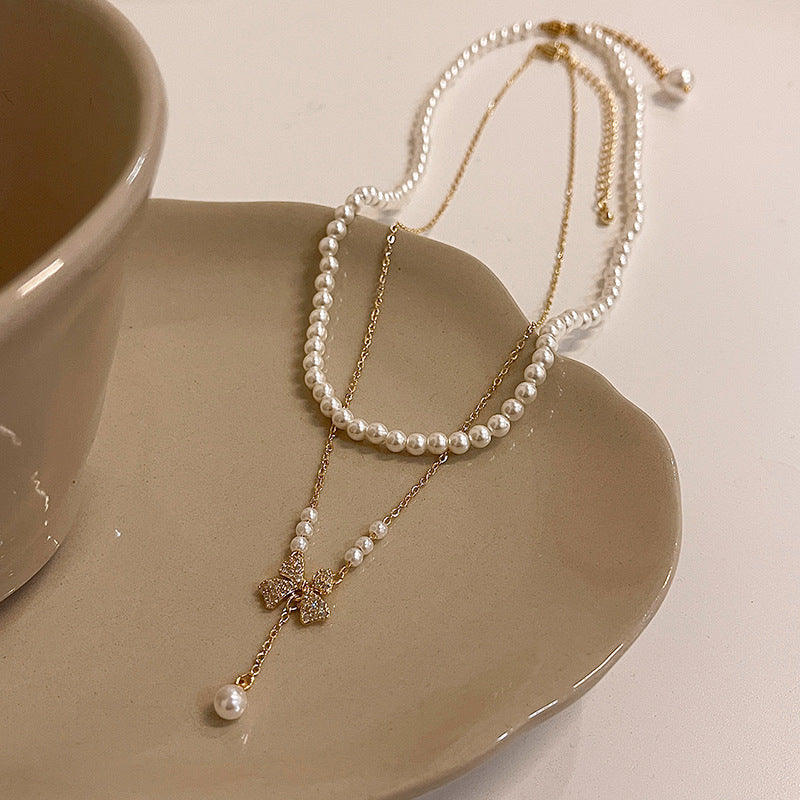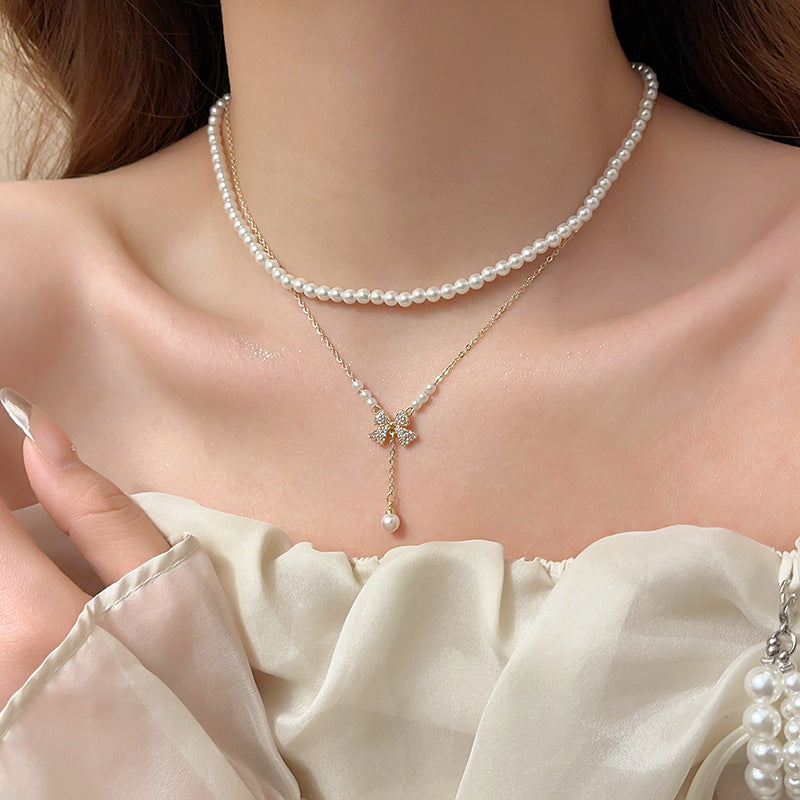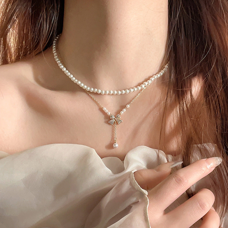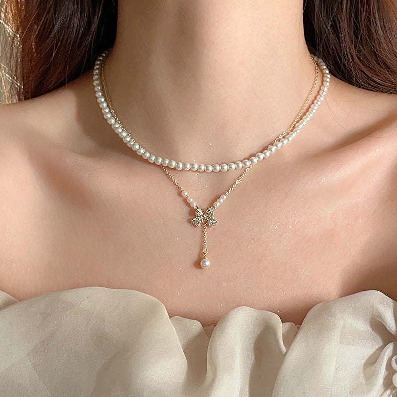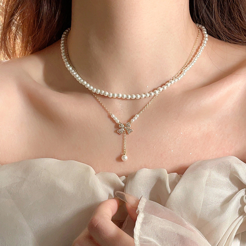 法式復古蝴蝶疊戴珍珠項鍊小衆百搭鎖骨鏈網紅輕奢高級感項飾