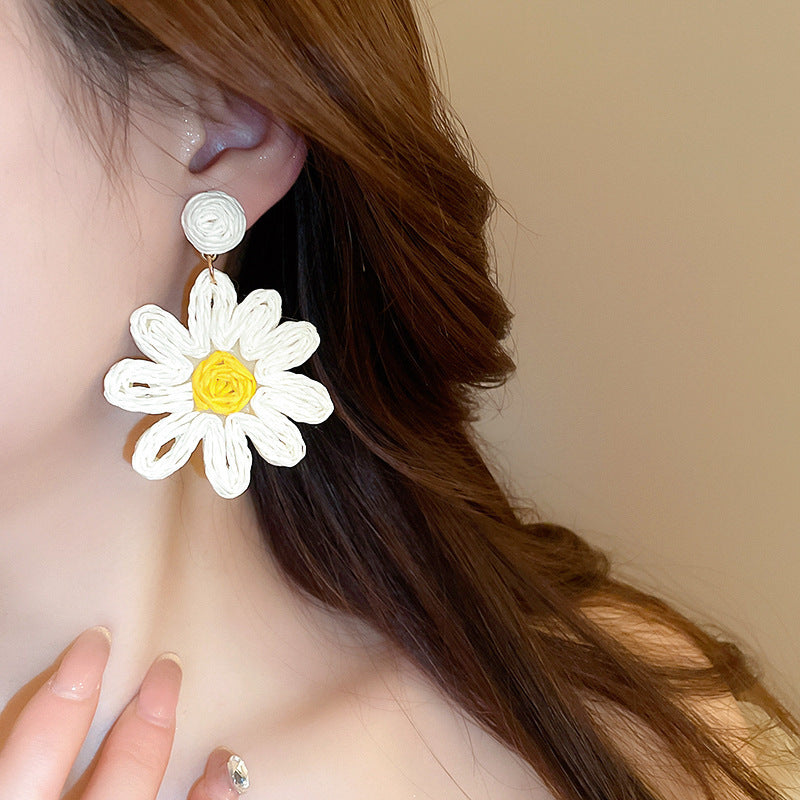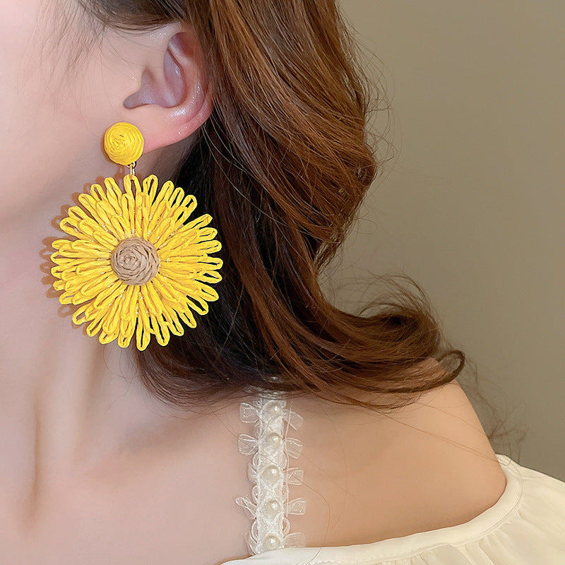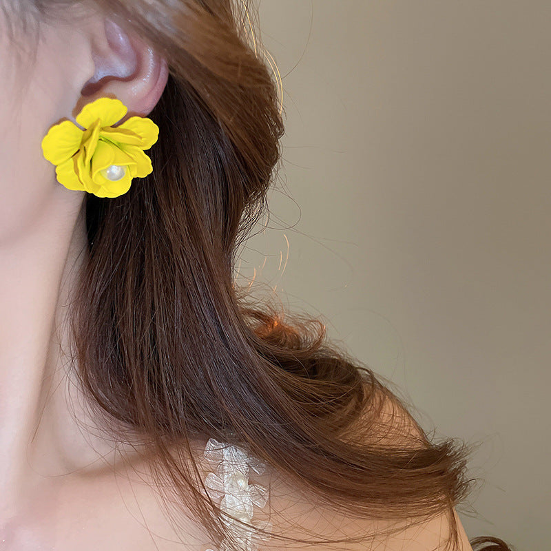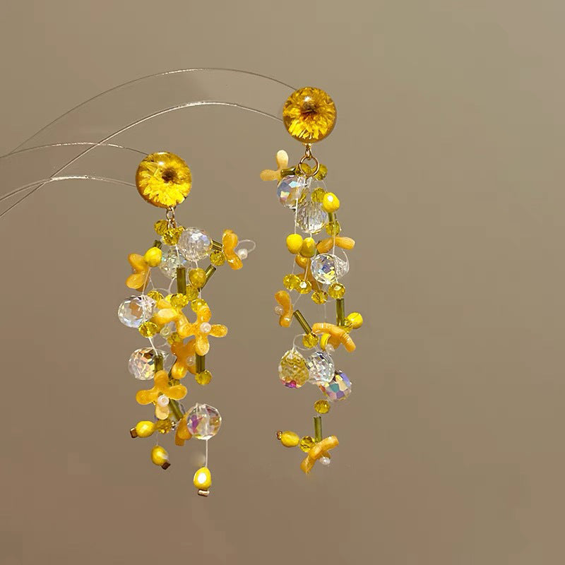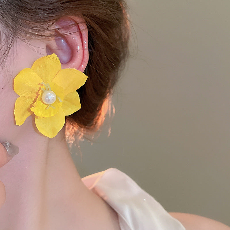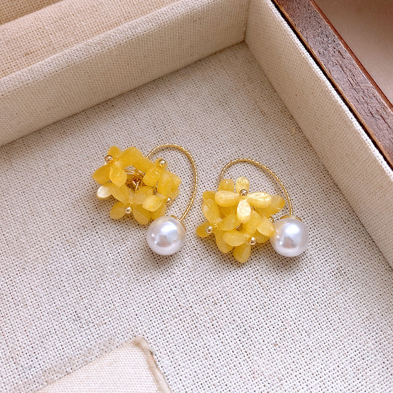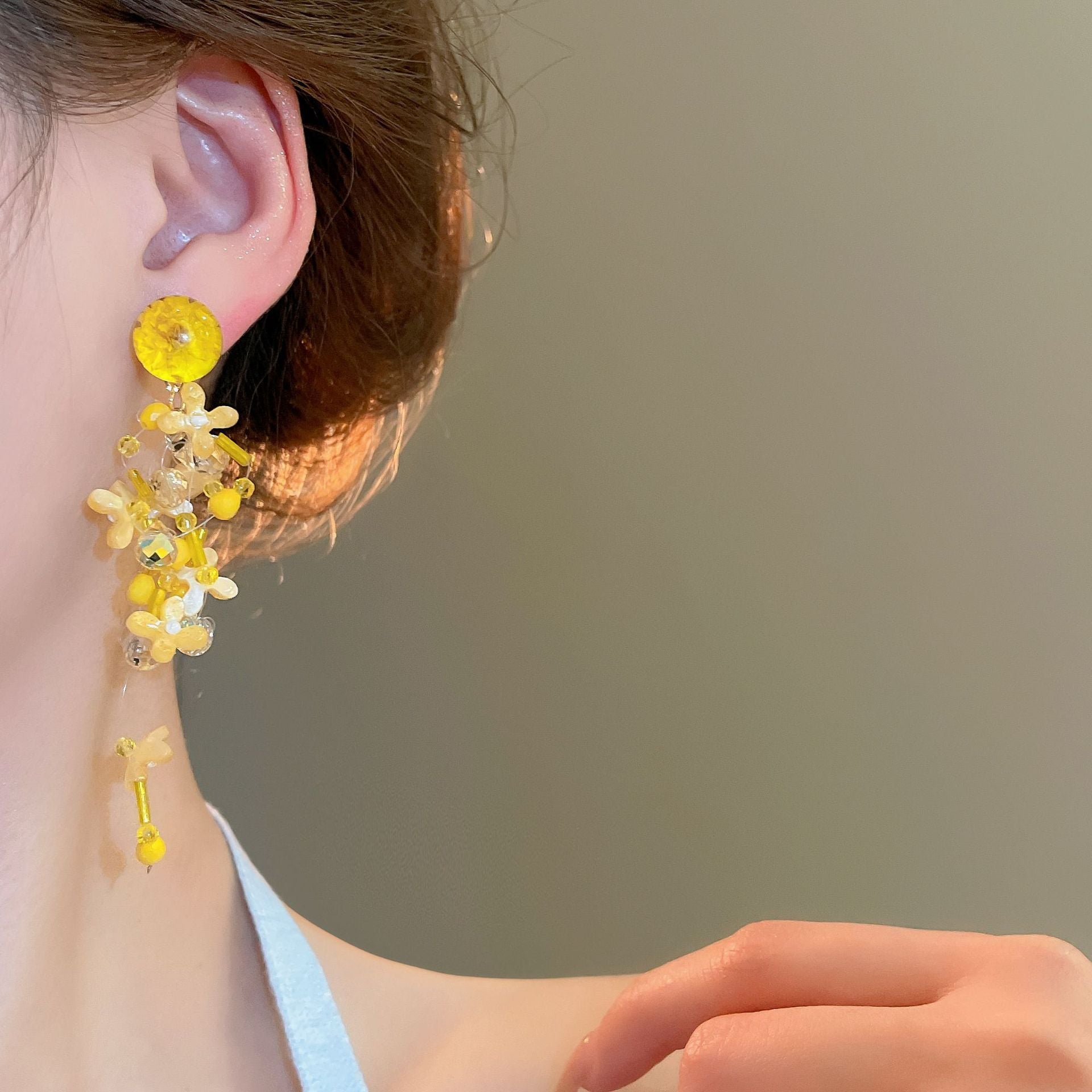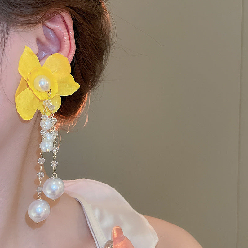 超仙甜美黃色布藝花朵流蘇珍珠耳環小清新耳釘輕奢高級感耳飾女