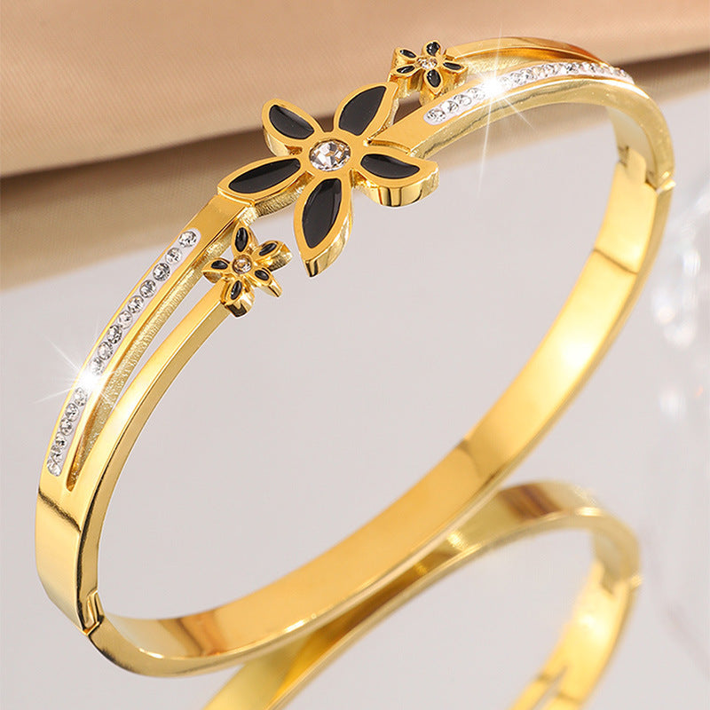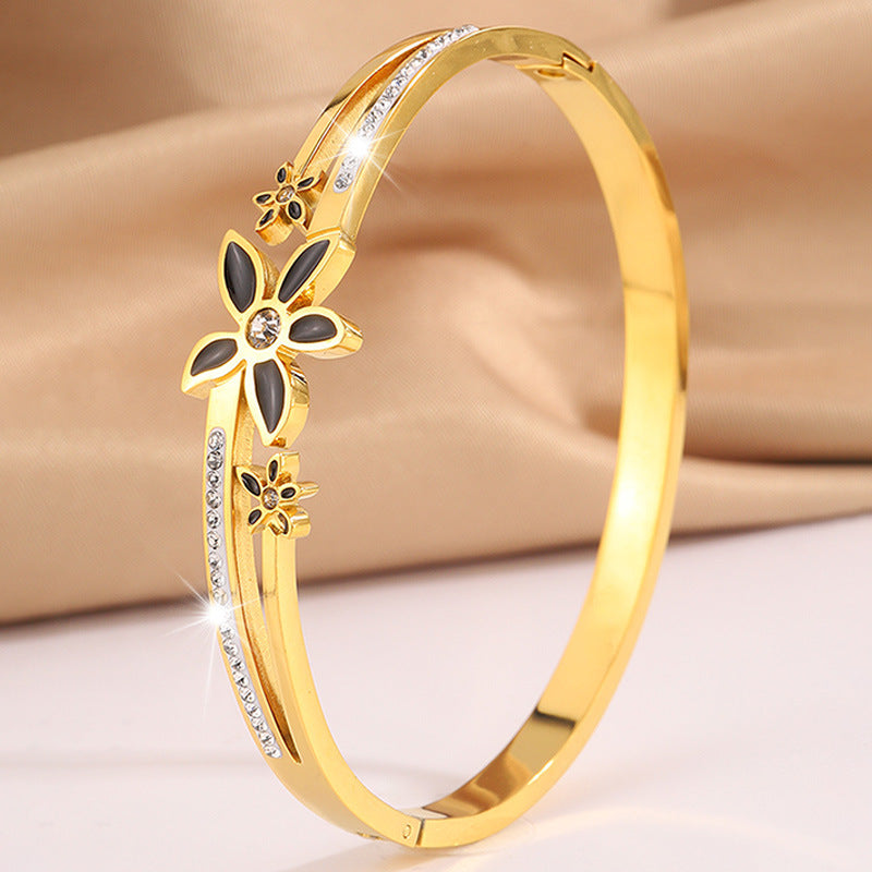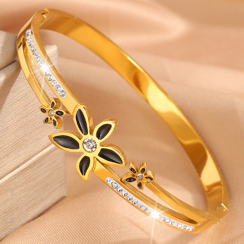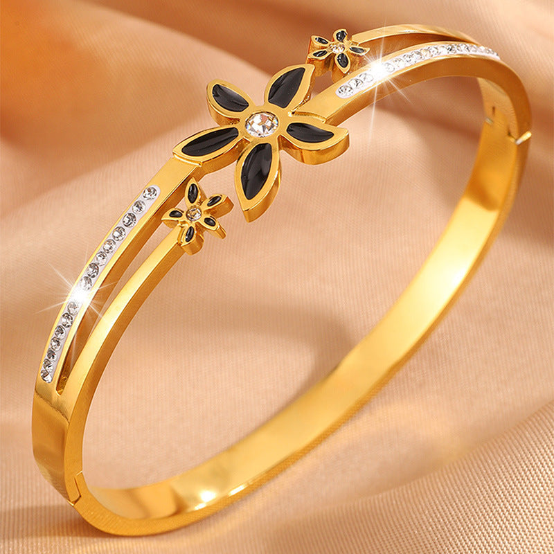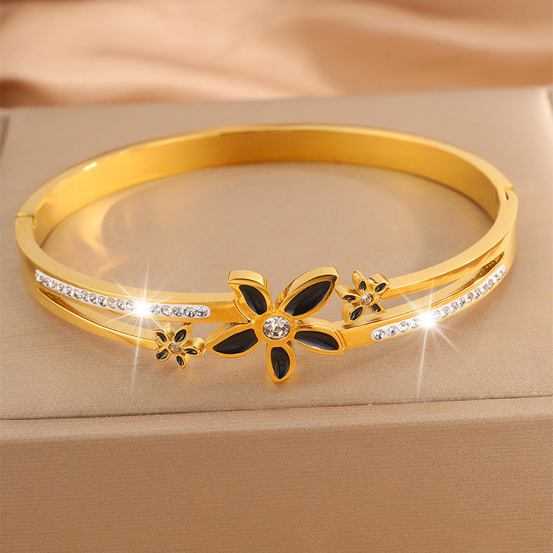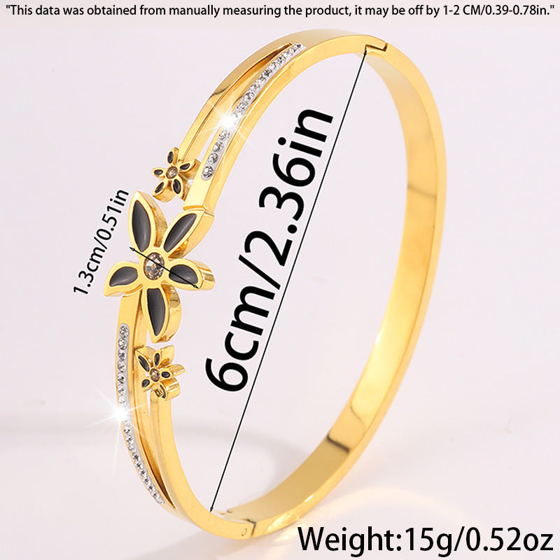 跨境輕奢高級感開口花朵鑲鑽鈦鋼手鐲女歐美時尚百搭不掉色飾品