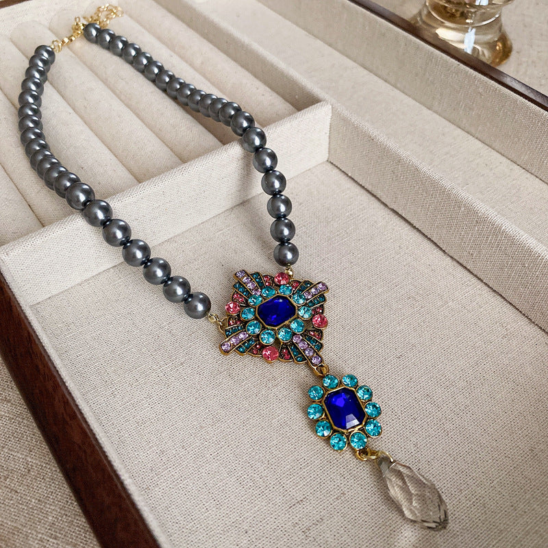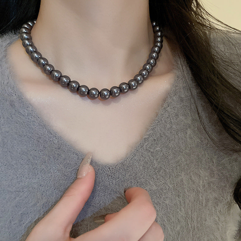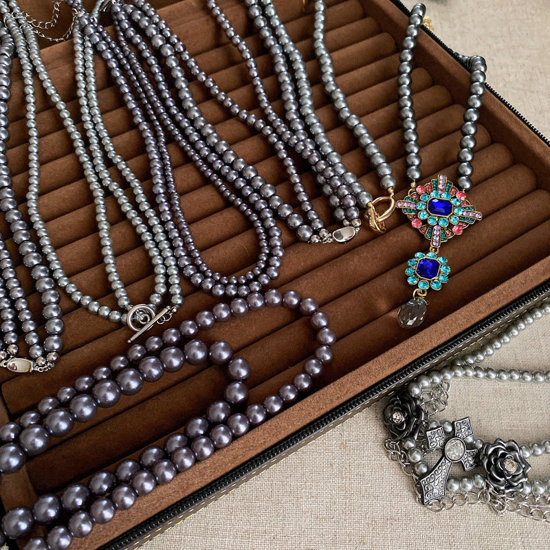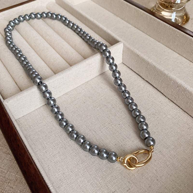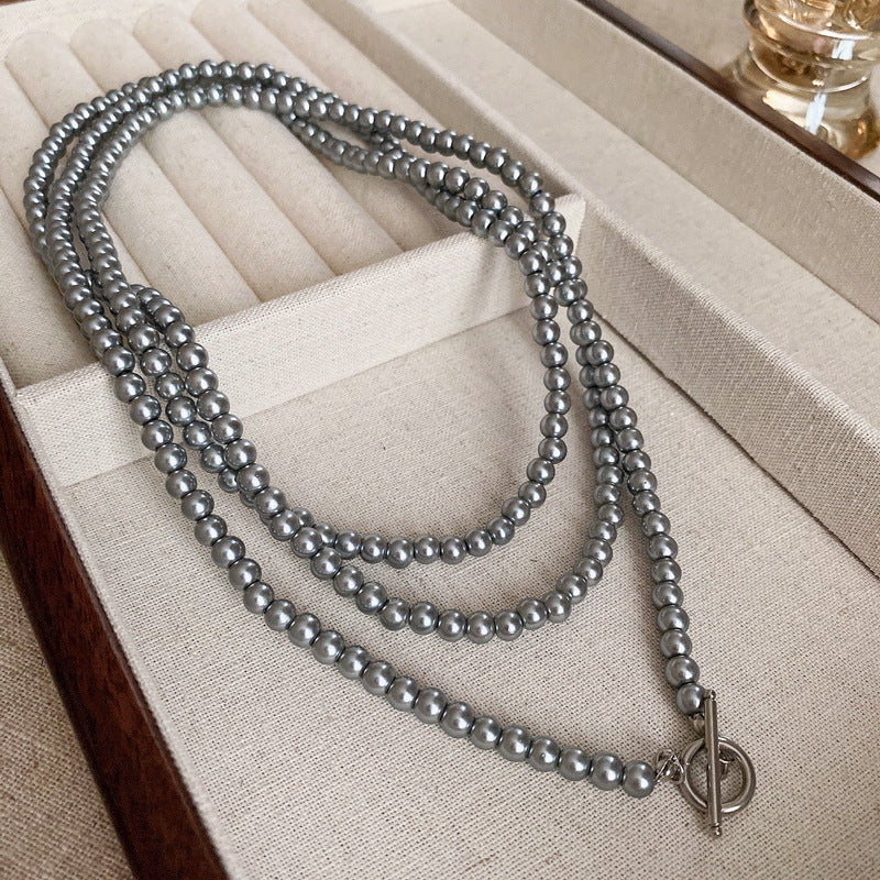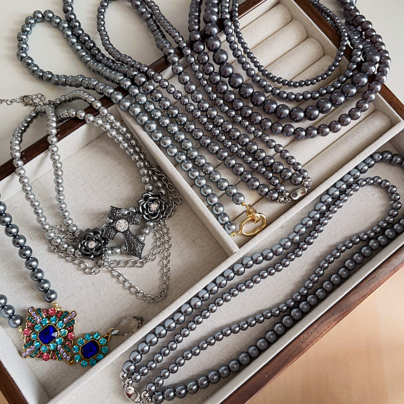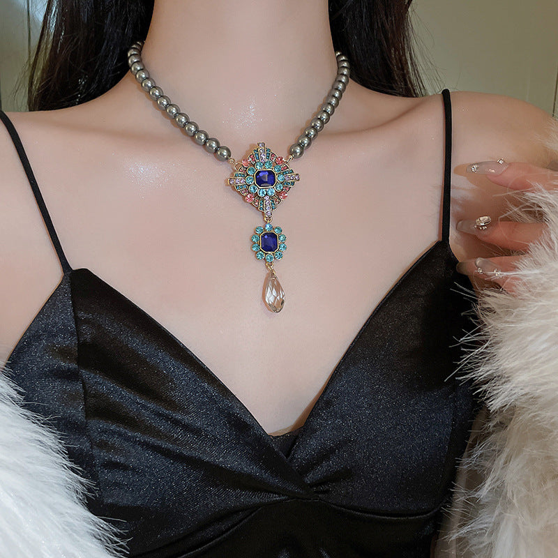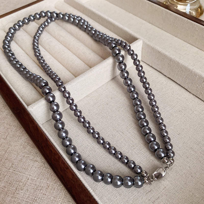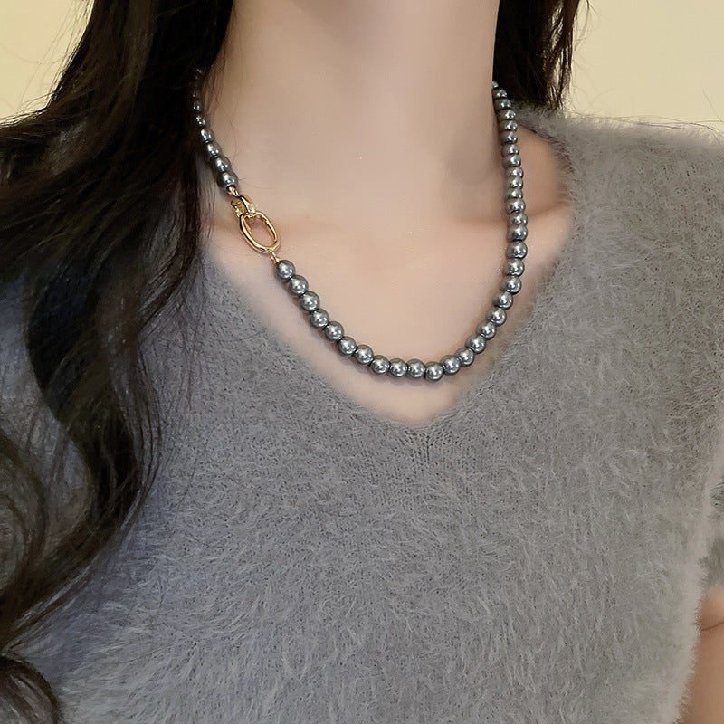 高級感鑲鑽灰色珍珠項鍊網紅氣質鎖骨鏈毛衣鏈秋冬輕奢復古項飾女