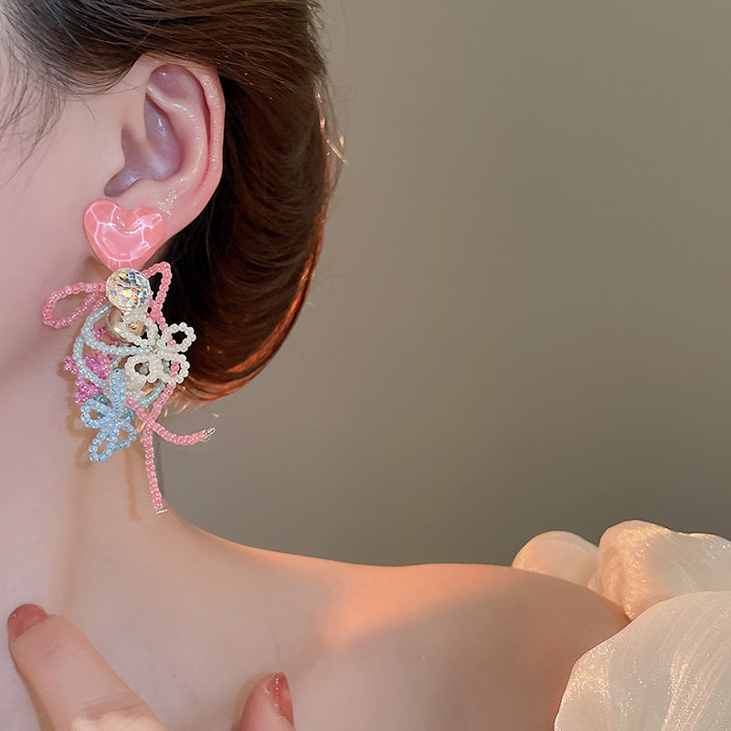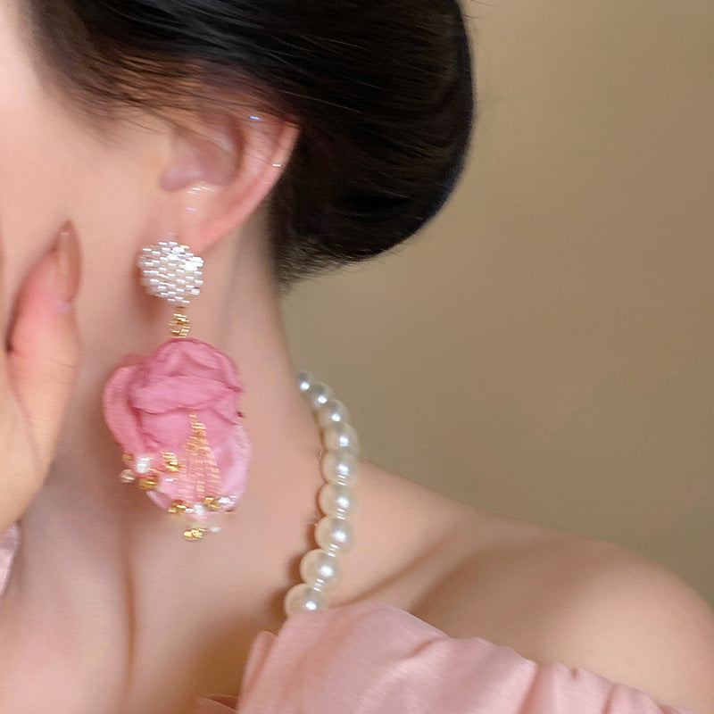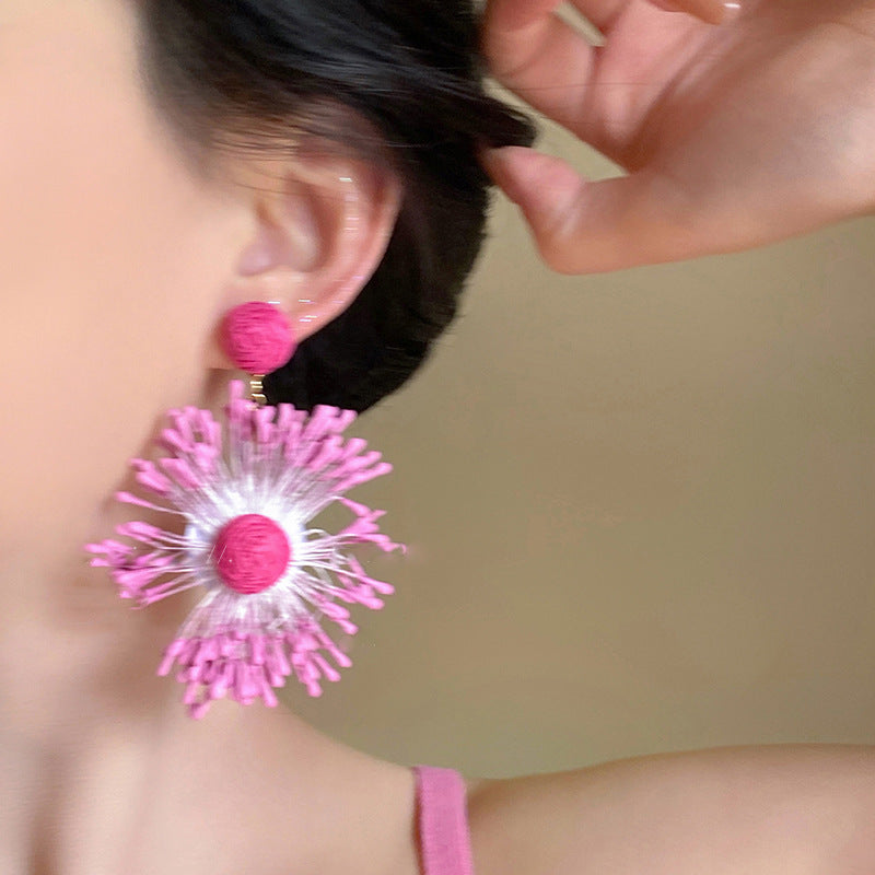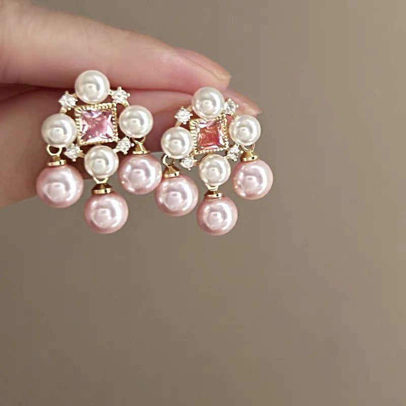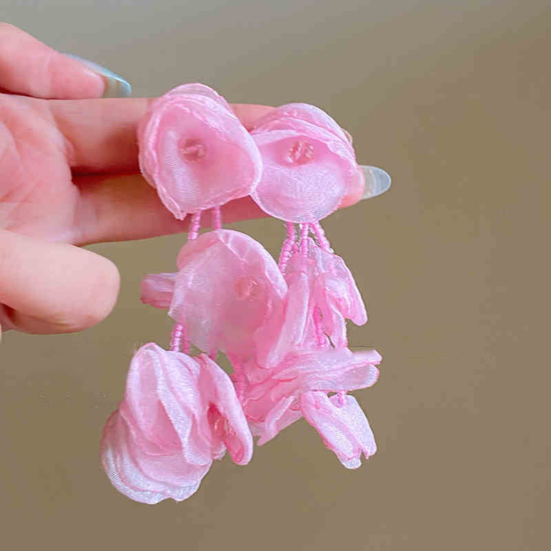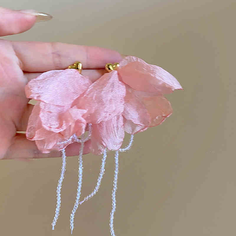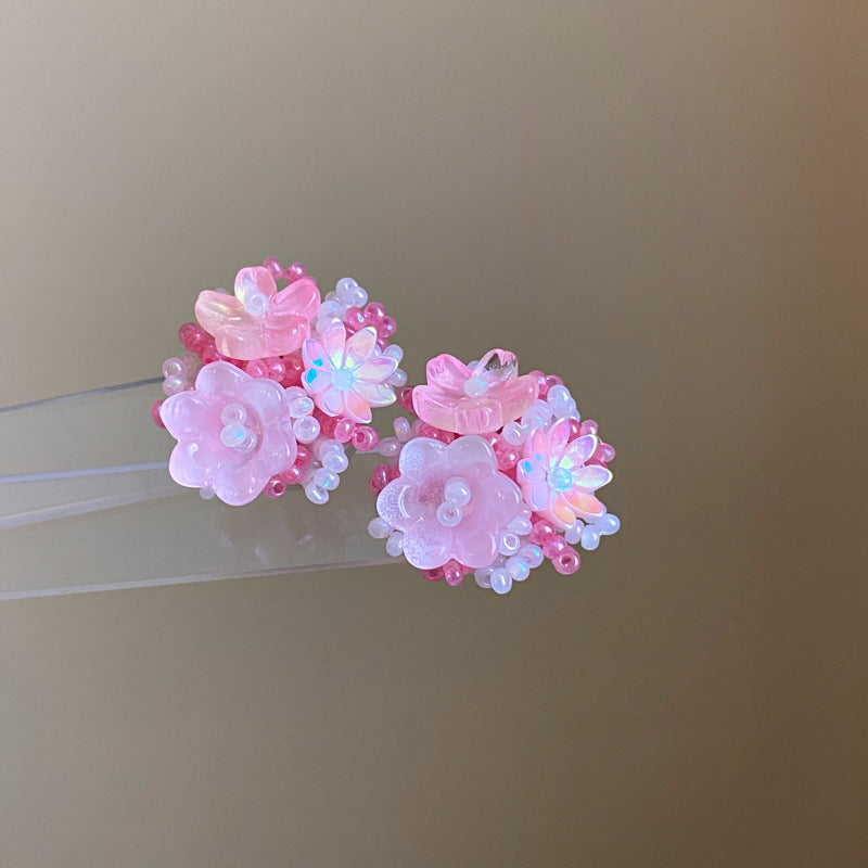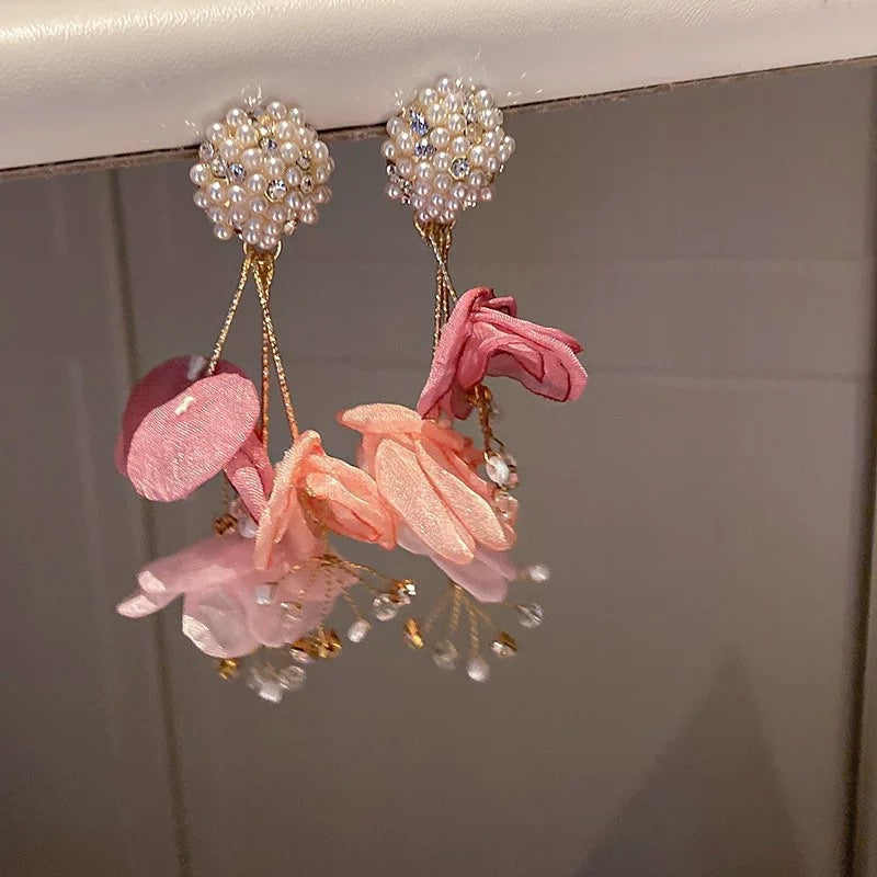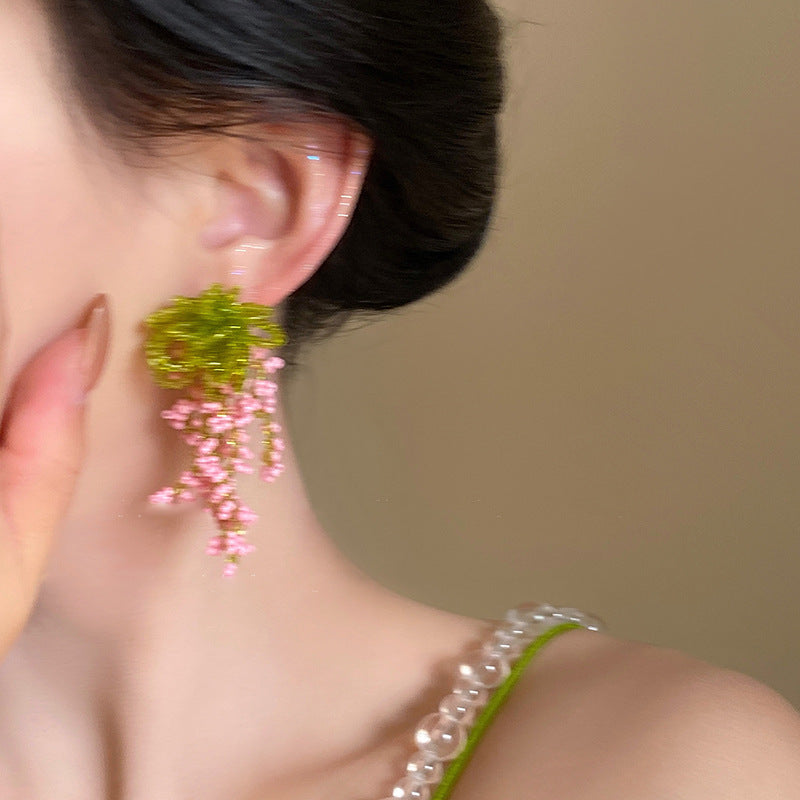 度假風粉色米珠花朵珍珠流蘇耳環少女氛圍感耳釘波西米亞甜美耳飾