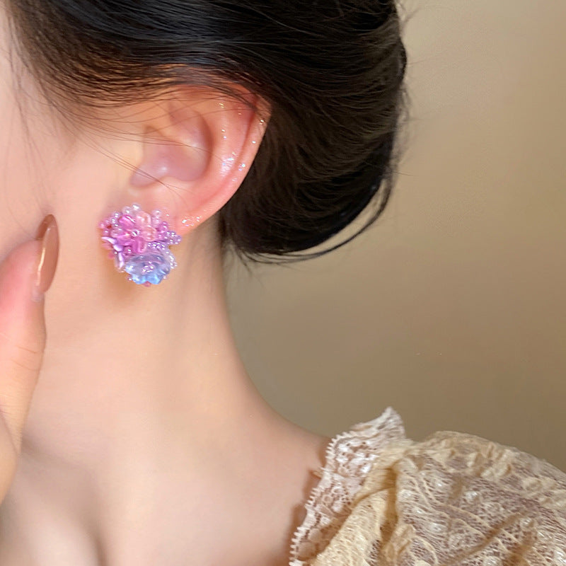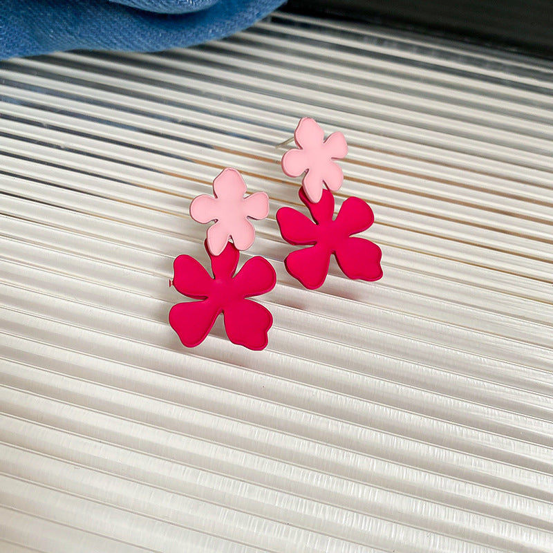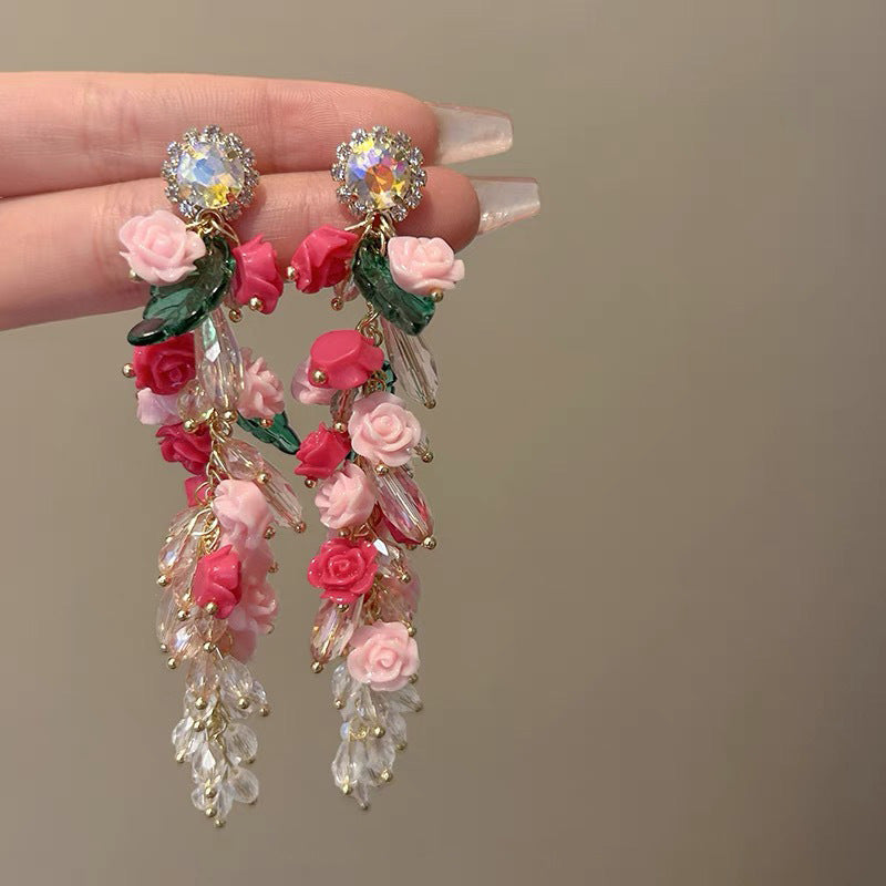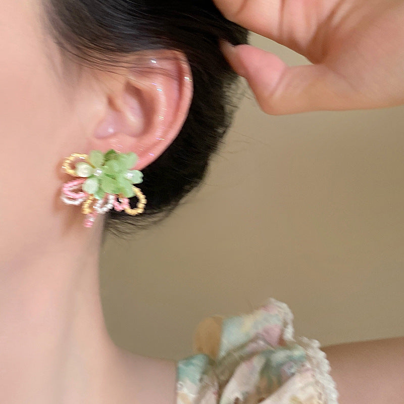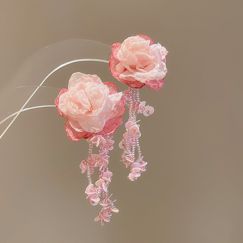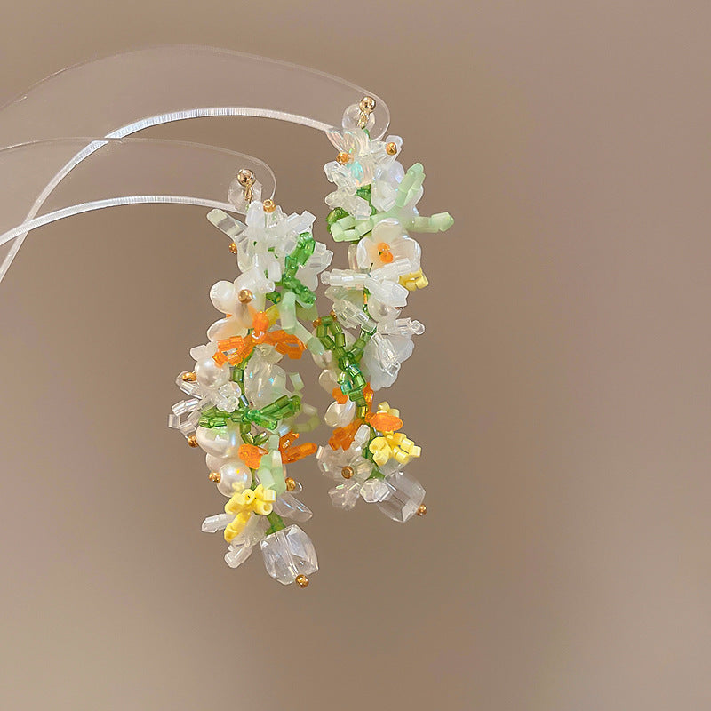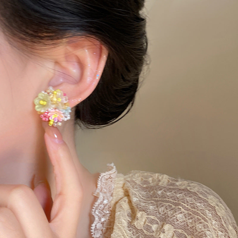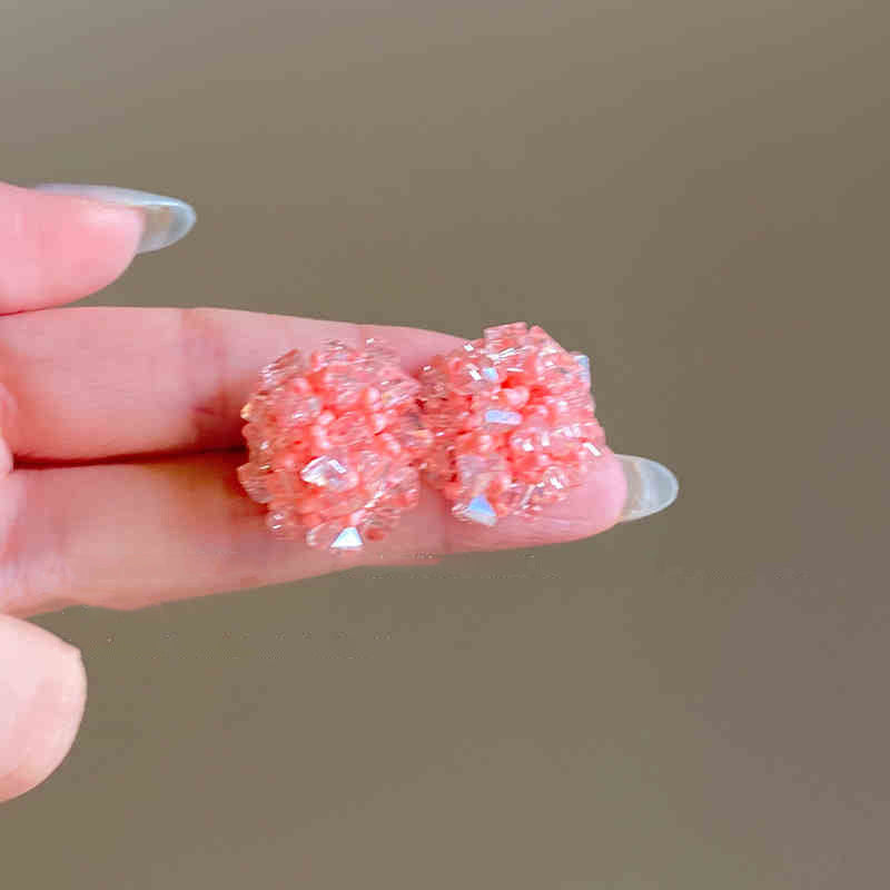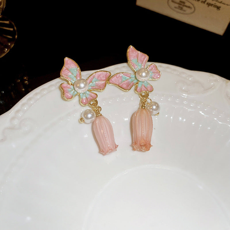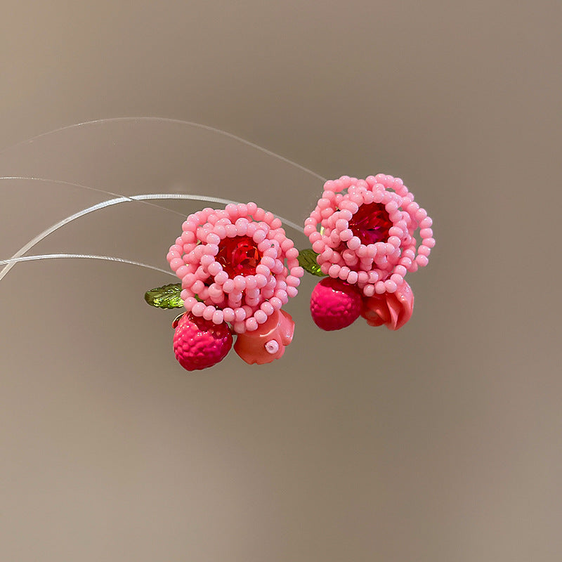 度假風粉色米珠花朵珍珠流蘇耳環少女氛圍感耳釘波西米亞甜美耳飾