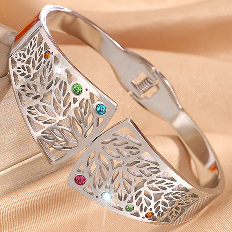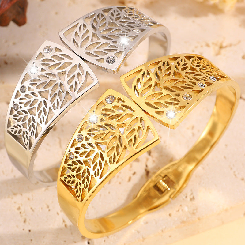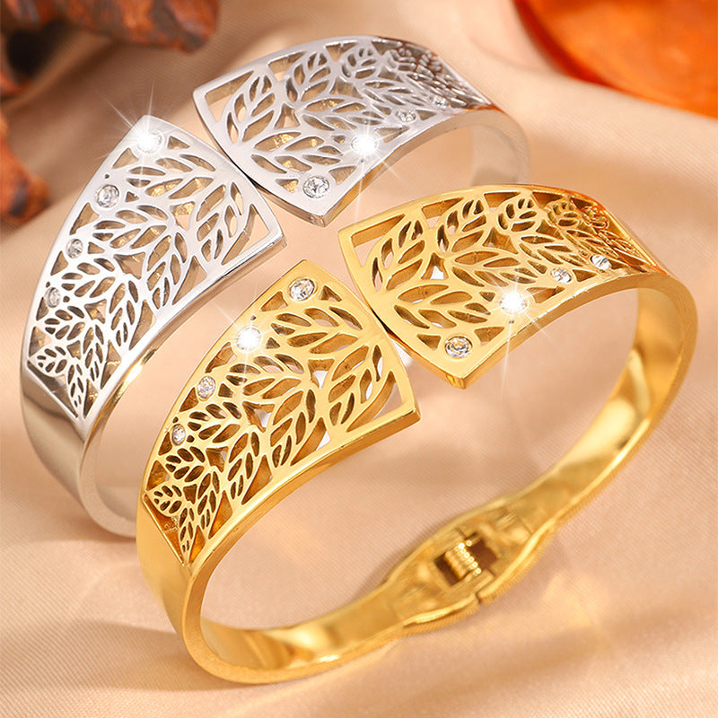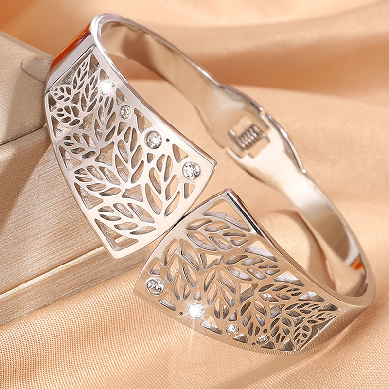 新品小衆跨境鏤空樹葉不鏽鋼手鐲女冷淡風簡約個性誇張飾品