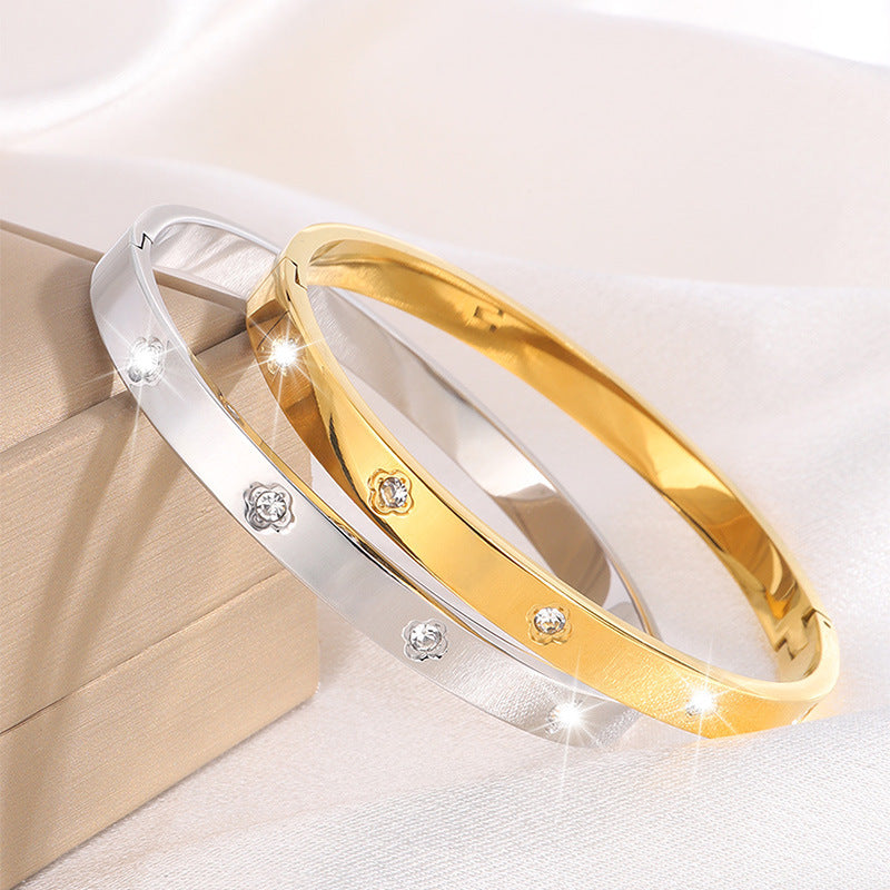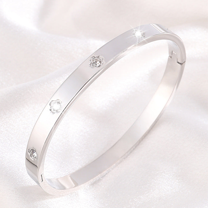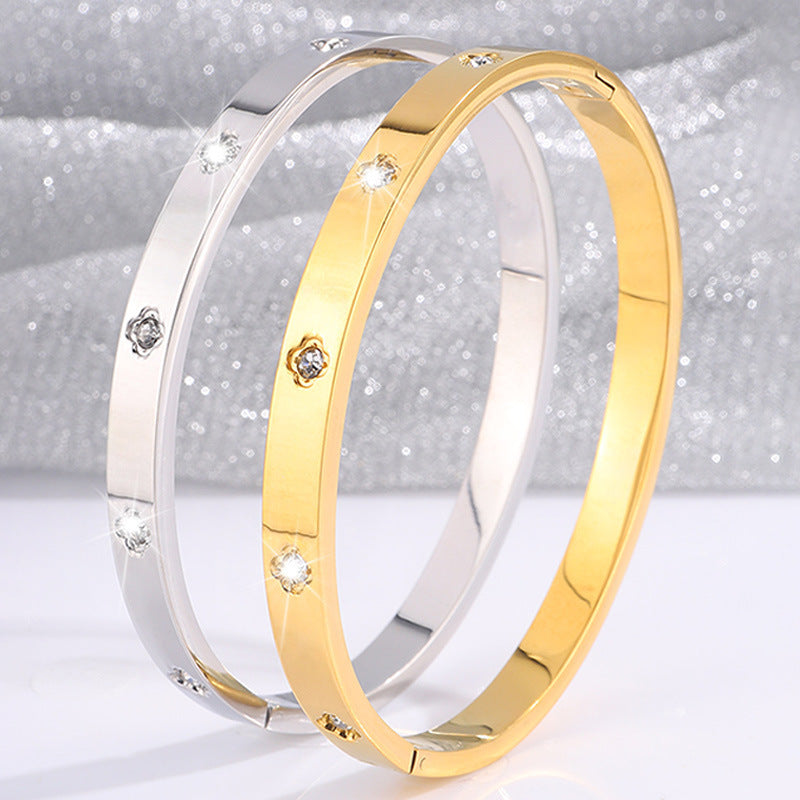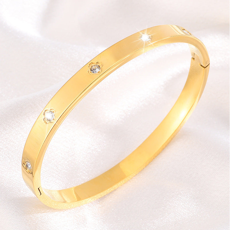 新款歐美時尚滿天星四葉十鑽手鐲情侶百搭真金不掉色鈦鋼手鐲飾品