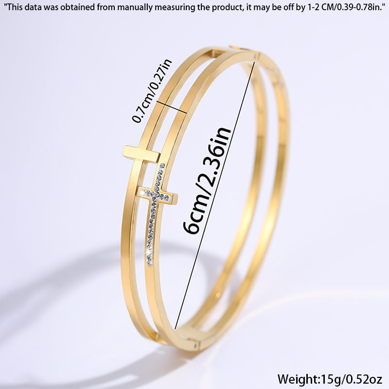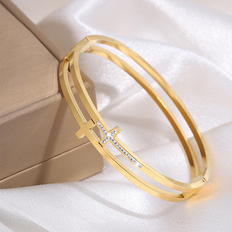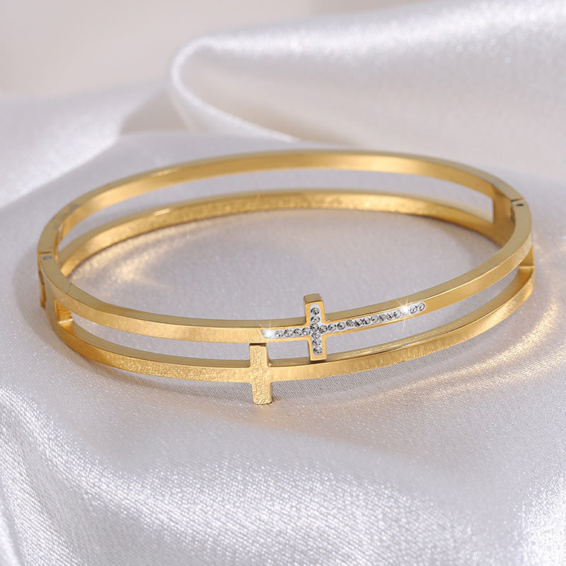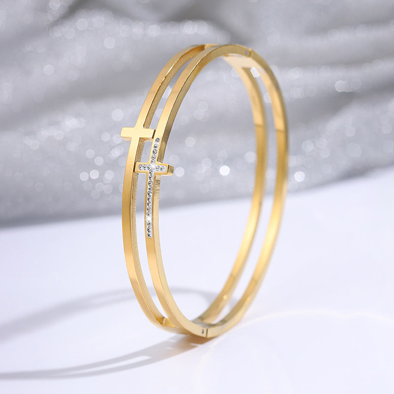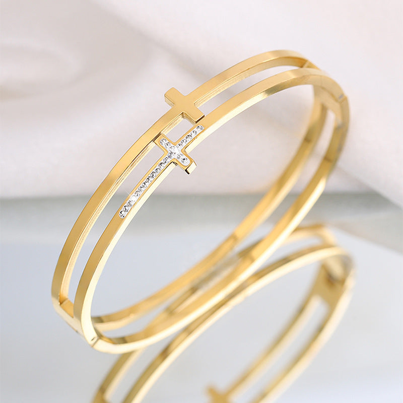 新款雙層十字鏤空鑲鑽暗釦手鐲日韓簡約電鍍可洗澡不鏽鋼手鐲飾品