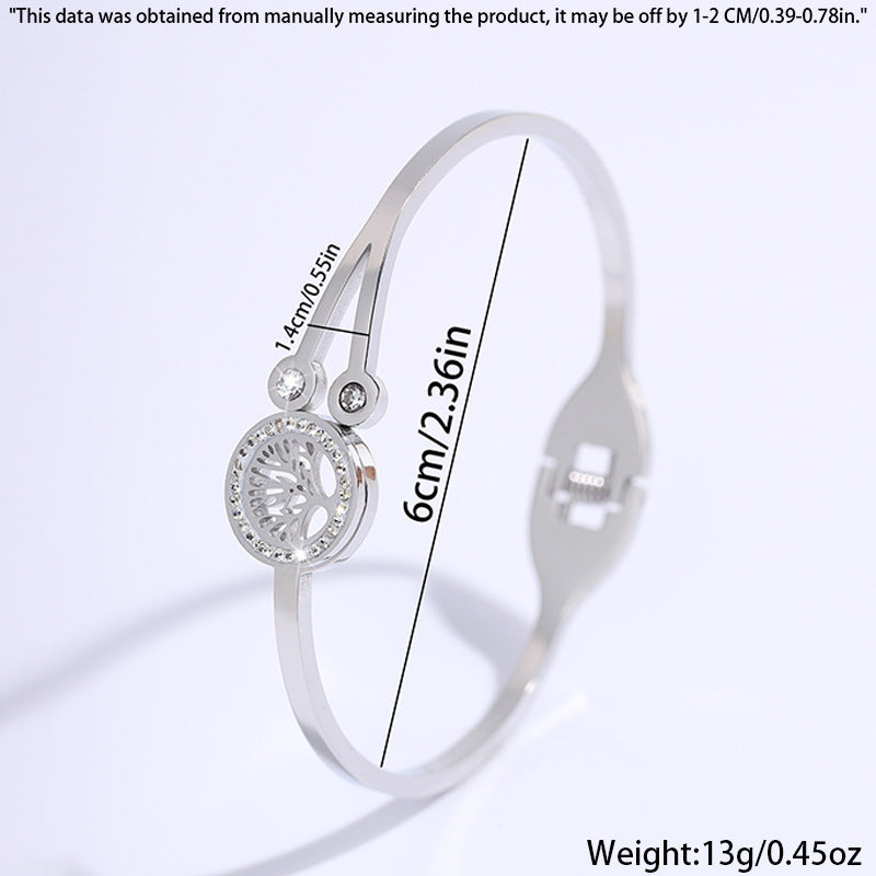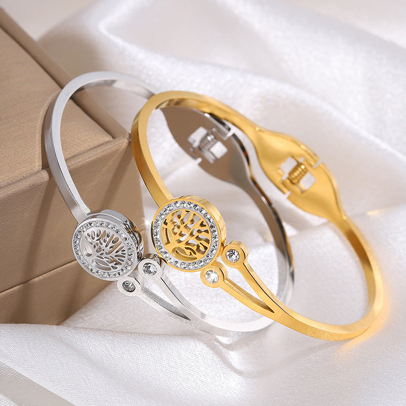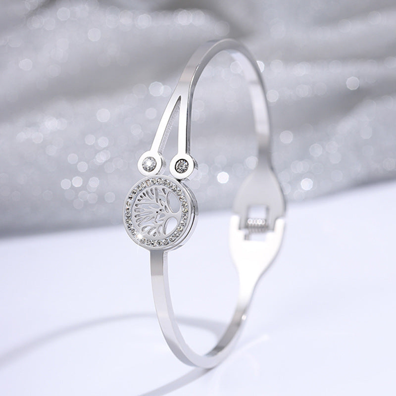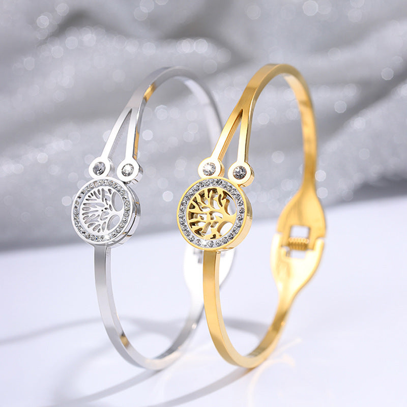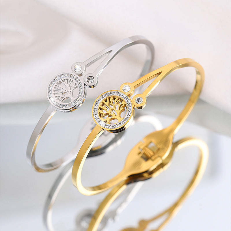 歐美新款不鏽鋼手鐲ins風生命樹開口鑲鑽卡扣高級不掉色鈦鋼手環