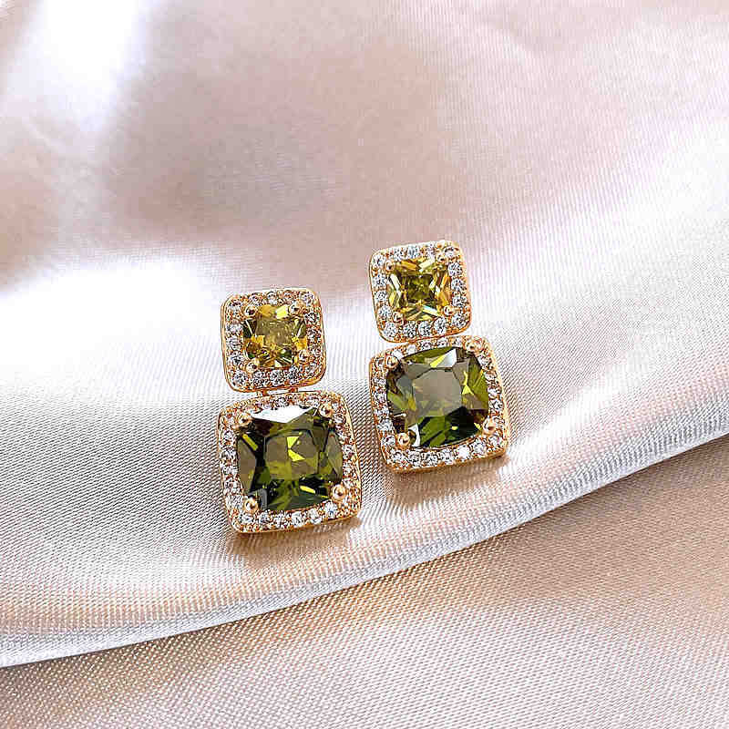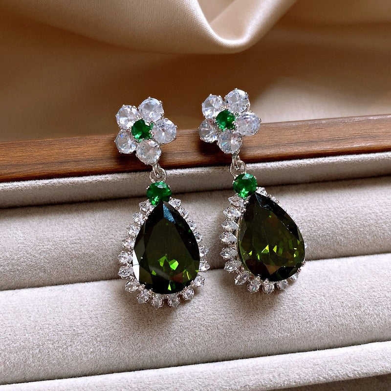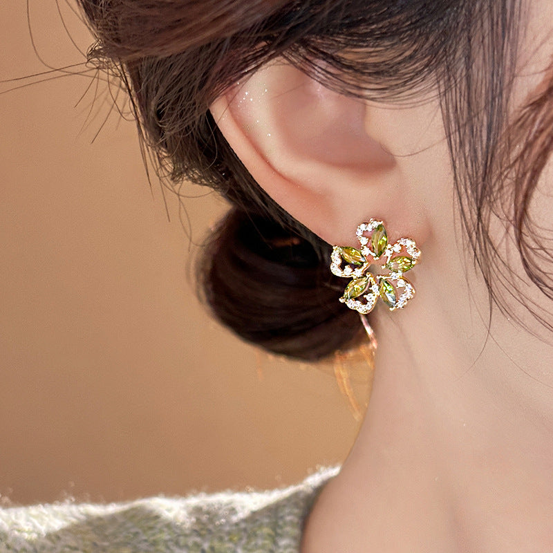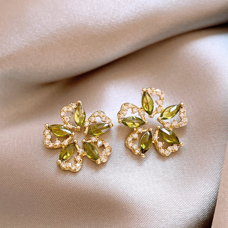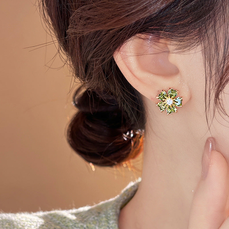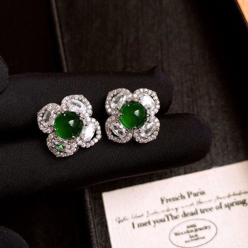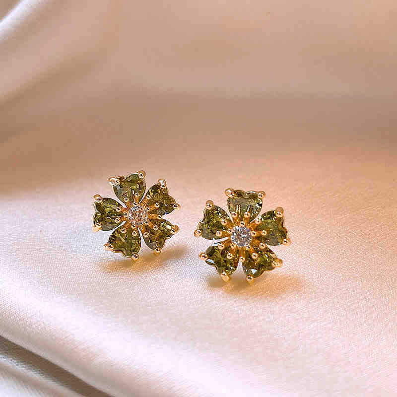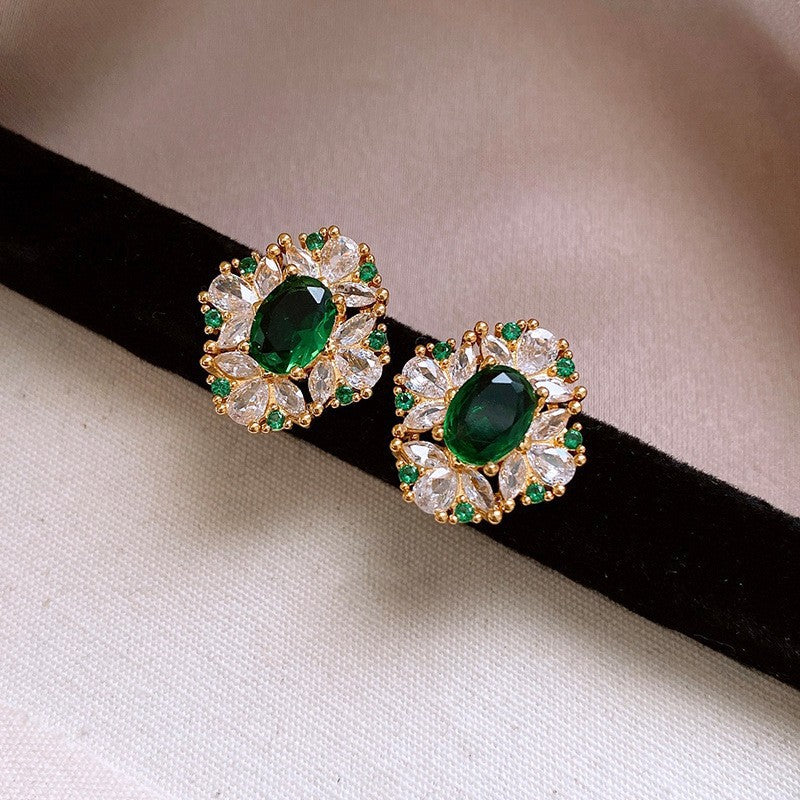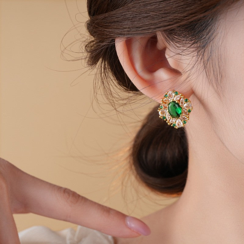 歐美跨境綠色鋯石花朵幾何耳釘氣質百搭耳環輕奢高級感耳飾設計感