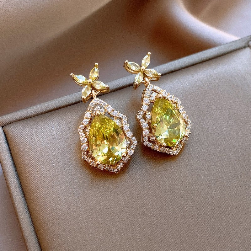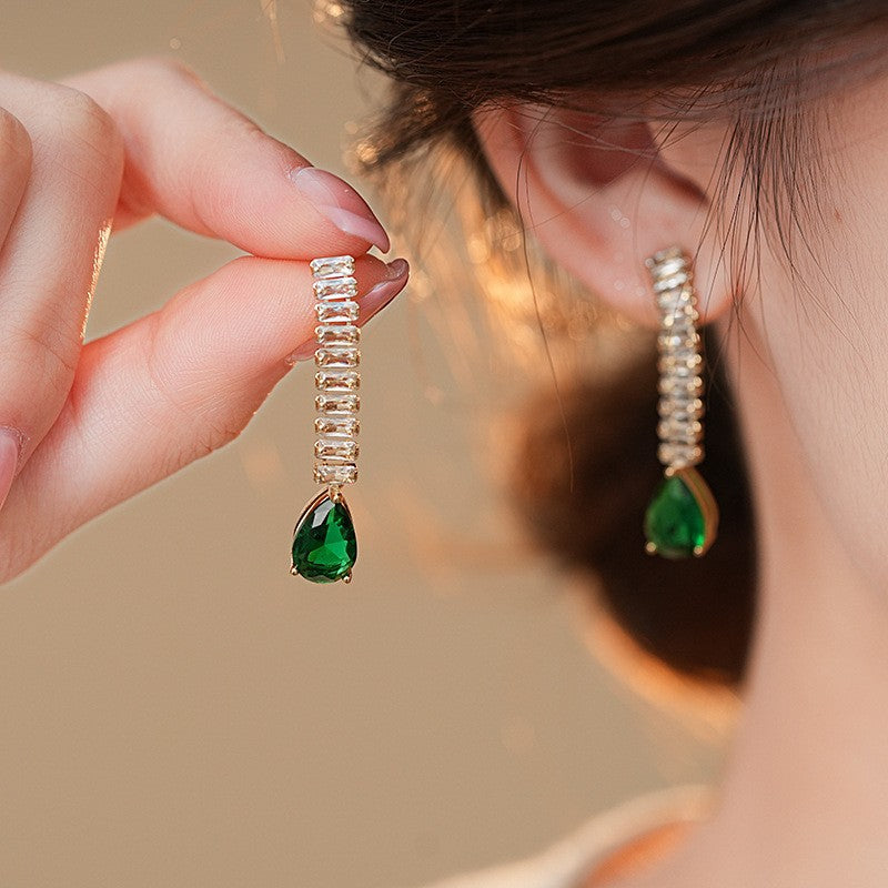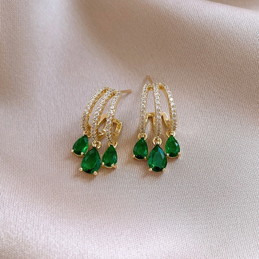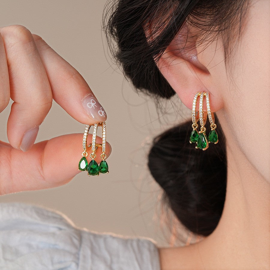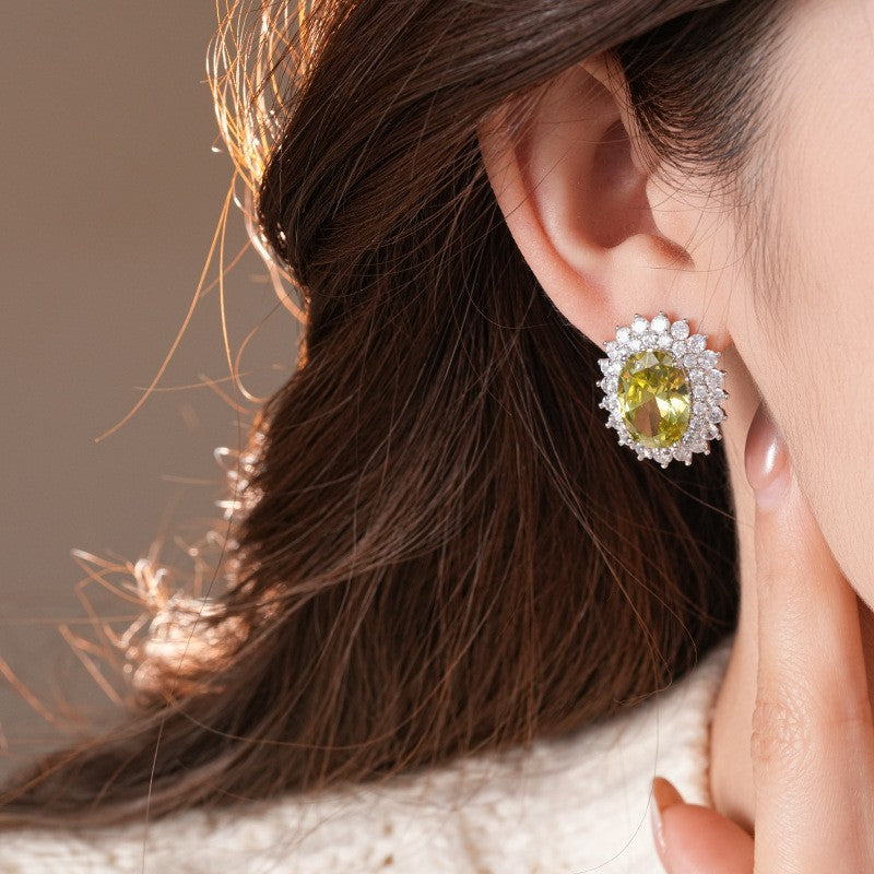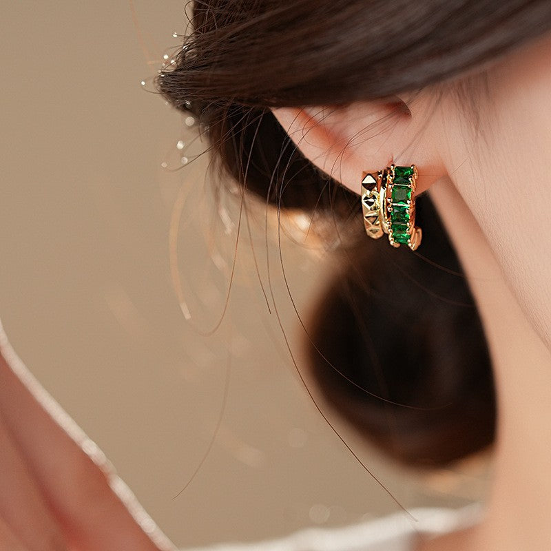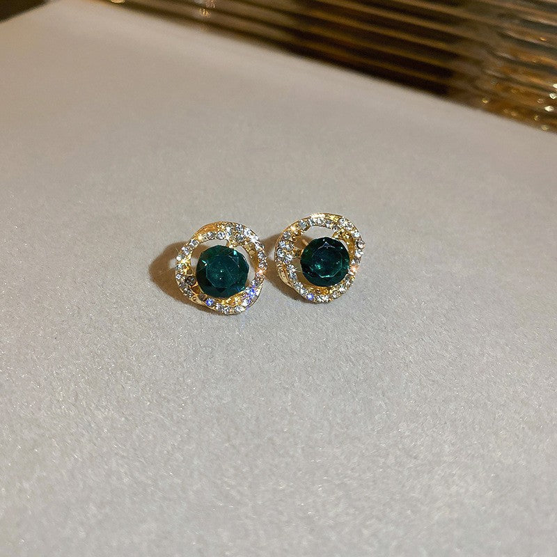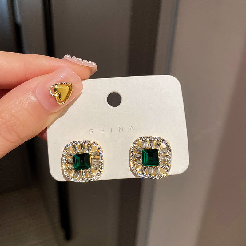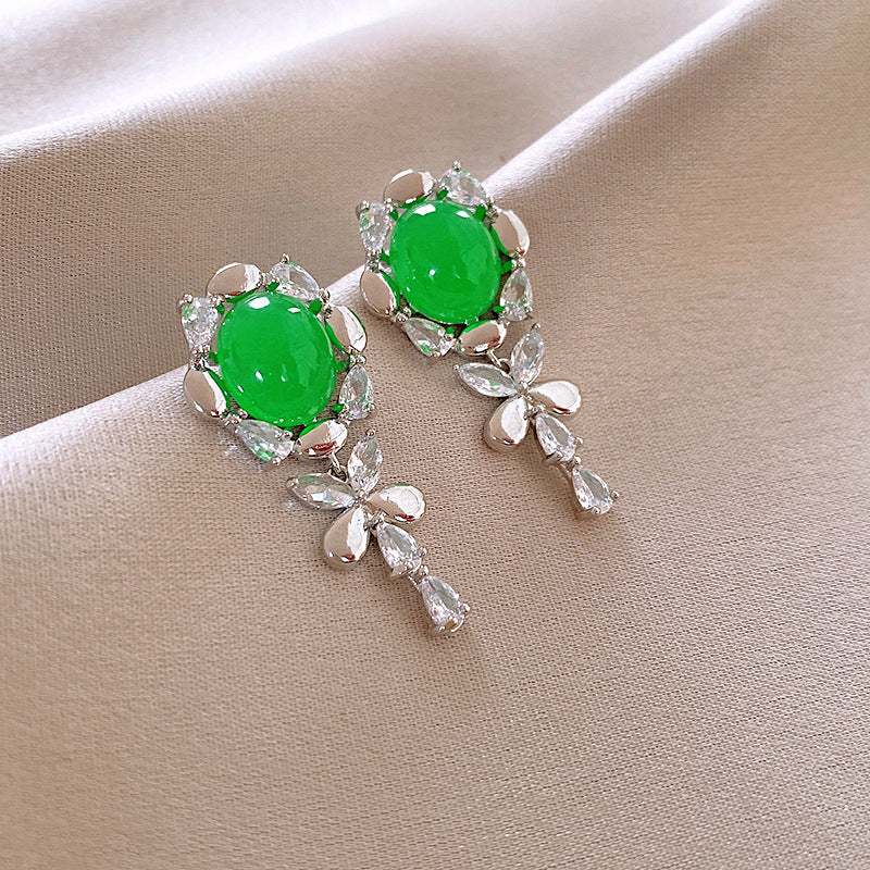 歐美跨境綠色鋯石花朵幾何耳釘氣質百搭耳環輕奢高級感耳飾設計感