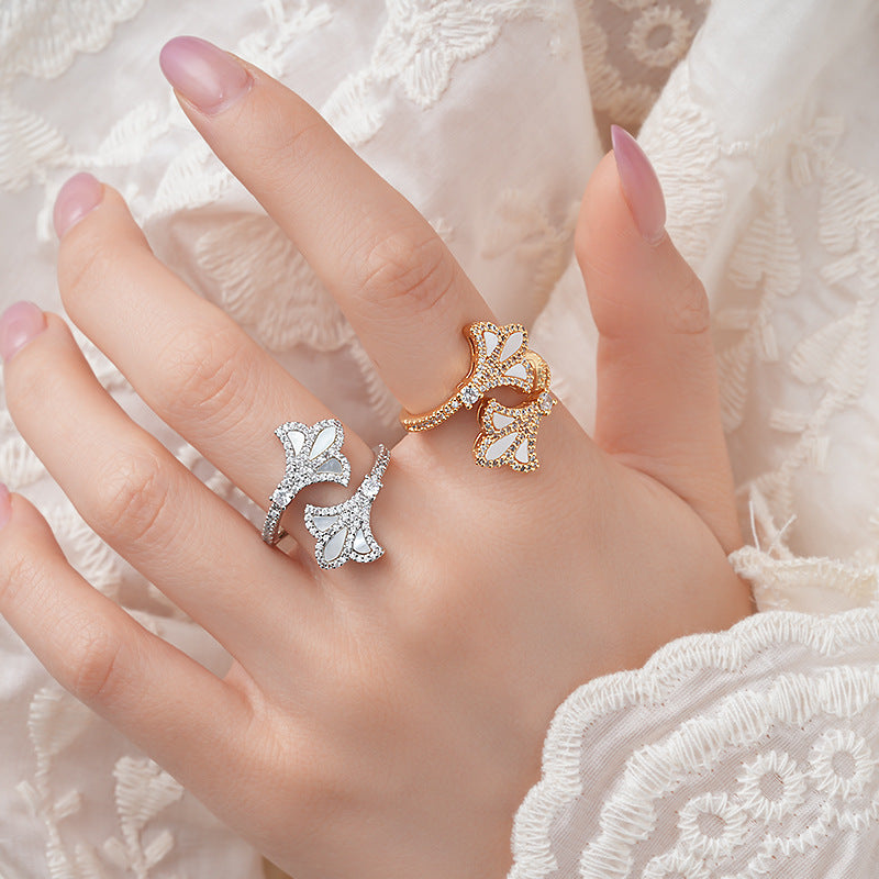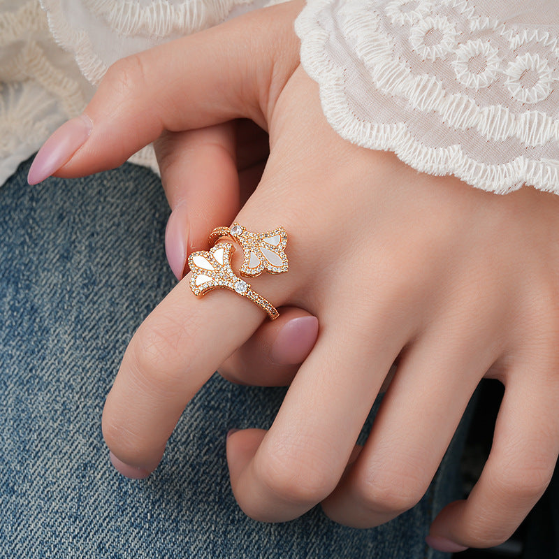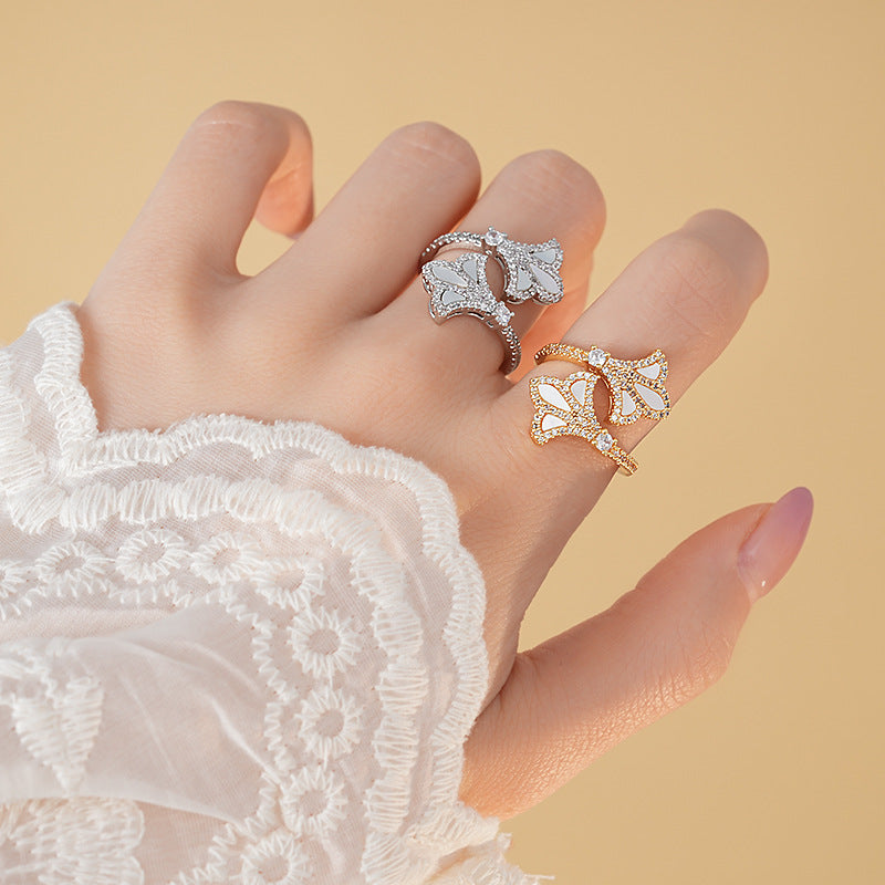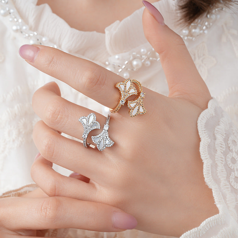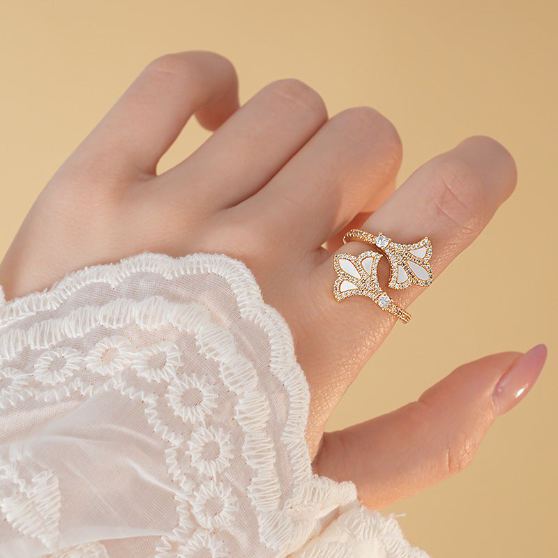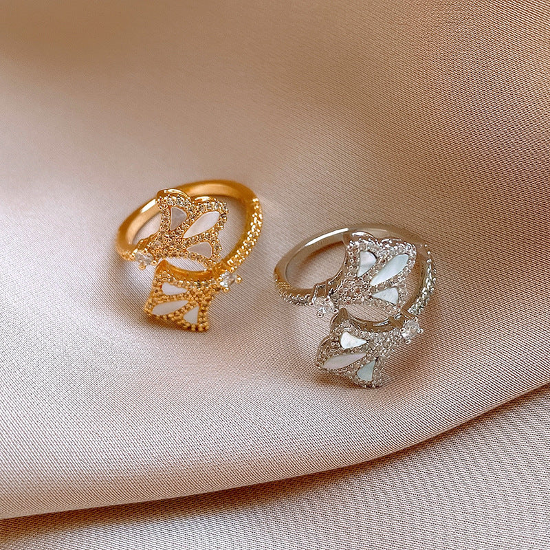 真金電鍍鋯石貝母魚尾開口戒指女輕奢小衆食指戒指環高級感手飾女