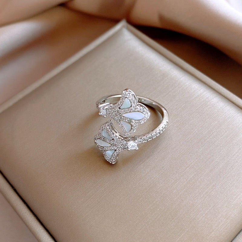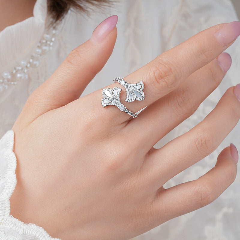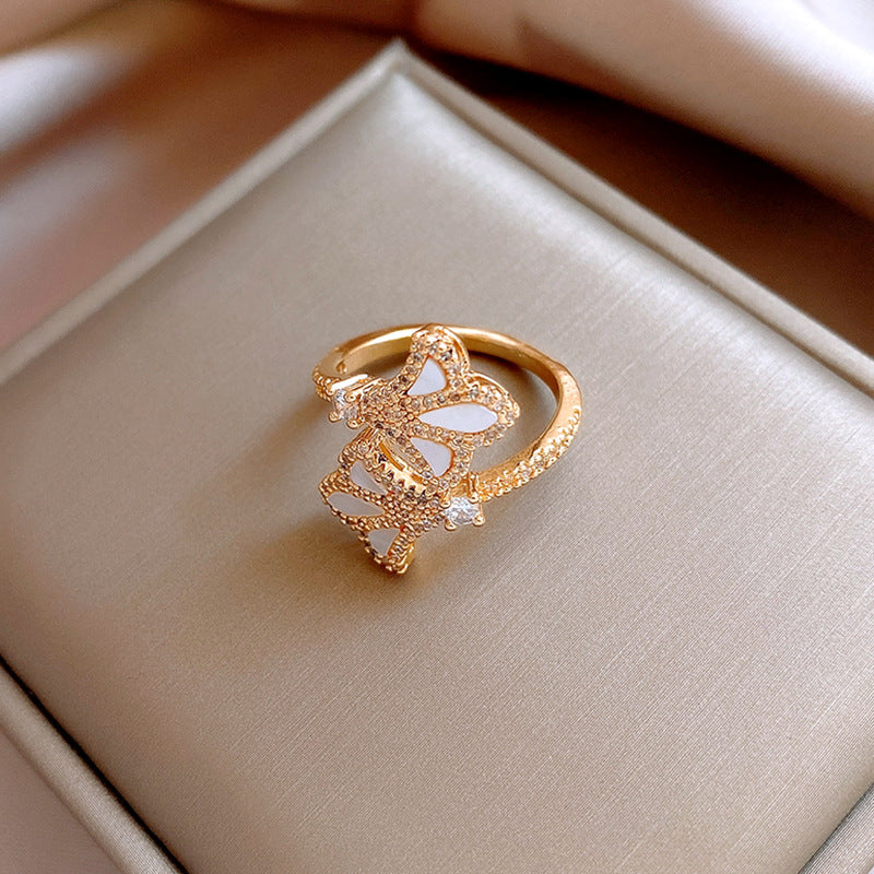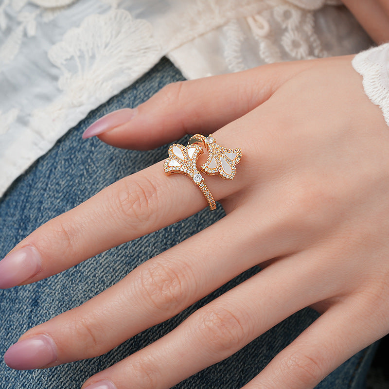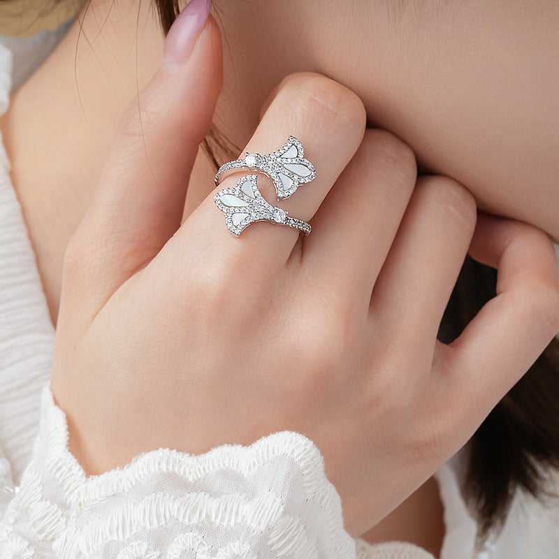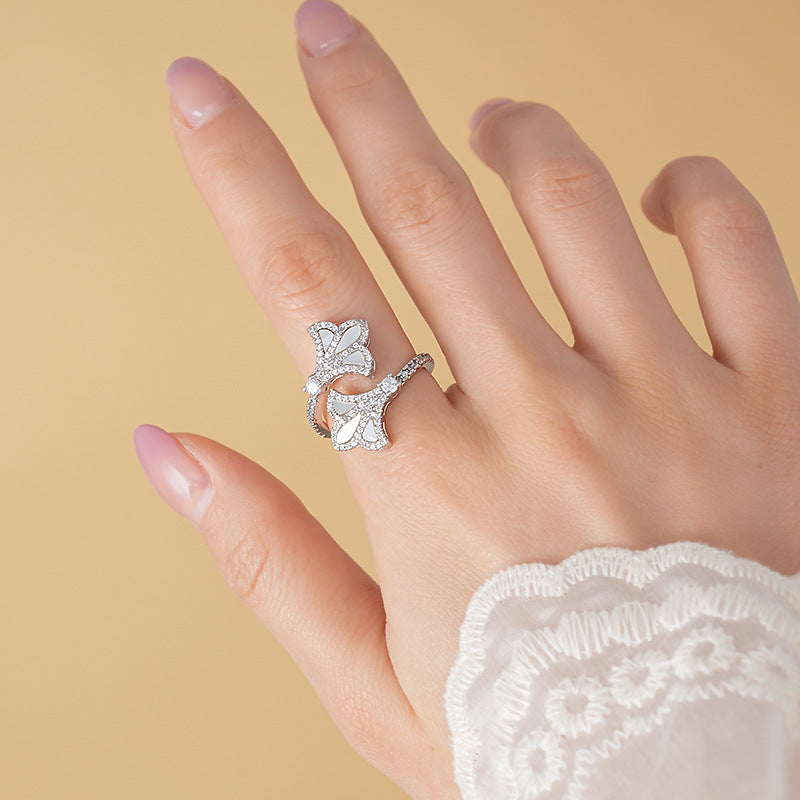 真金電鍍鋯石貝母魚尾開口戒指女輕奢小衆食指戒指環高級感手飾女