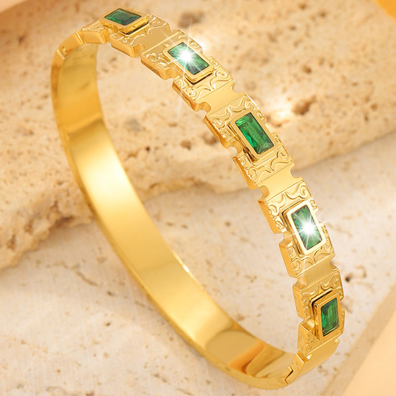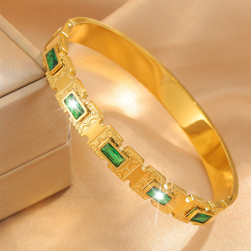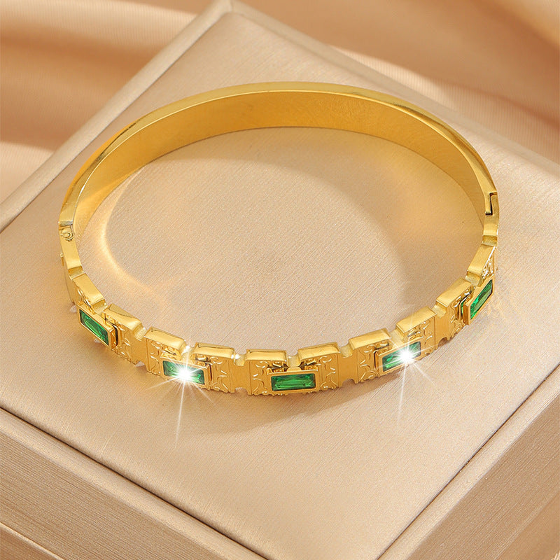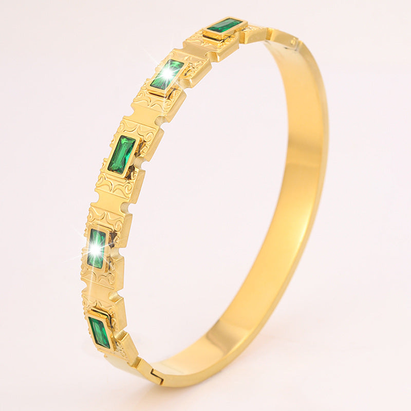 跨境新品不鏽鋼手鐲祖母綠鋯石鑲嵌高級感鈦鋼不掉色飾品手鐲首飾
