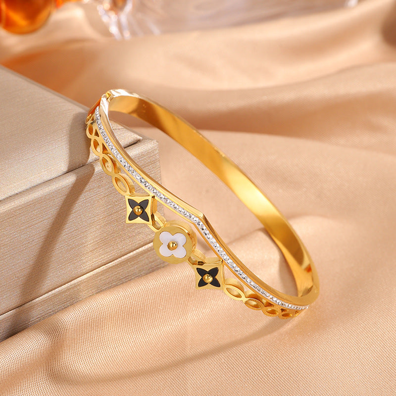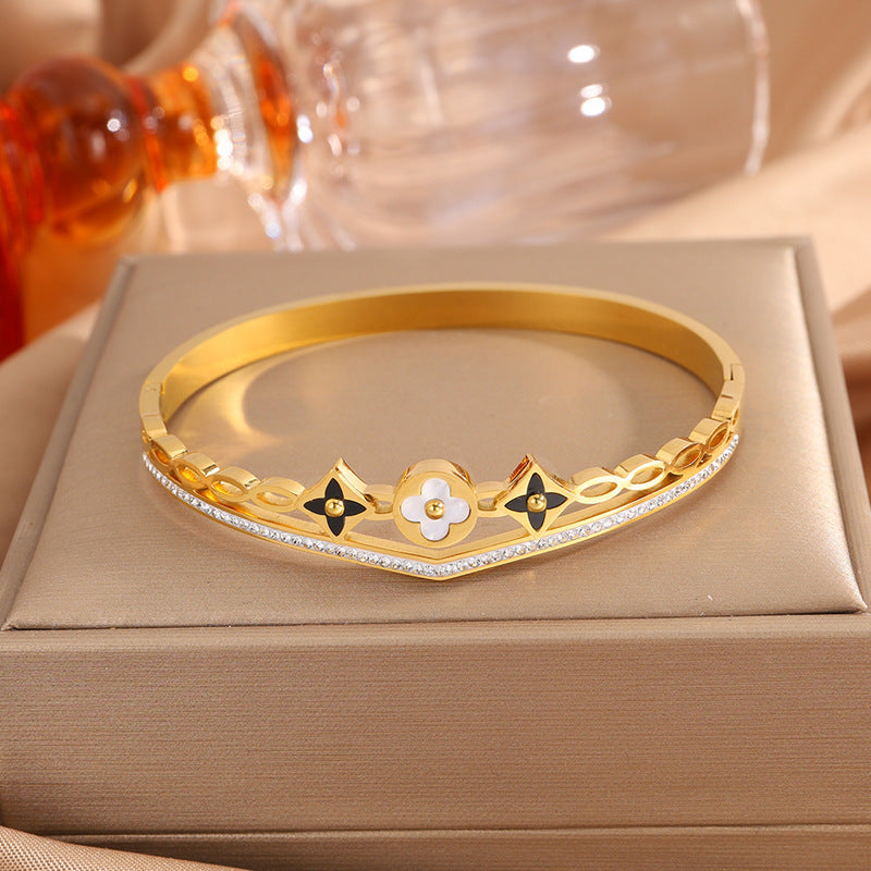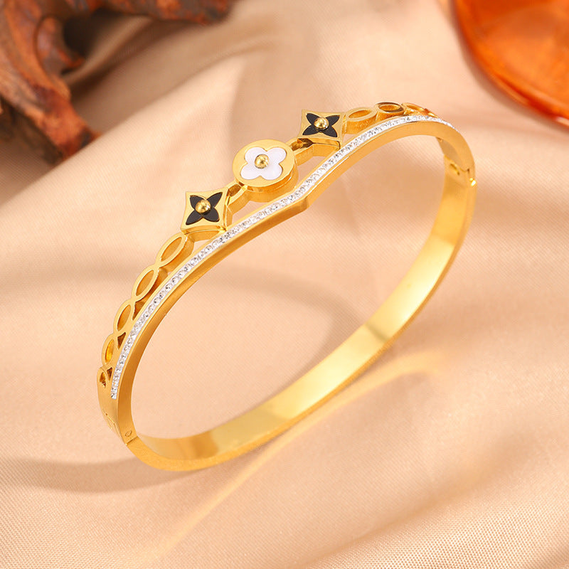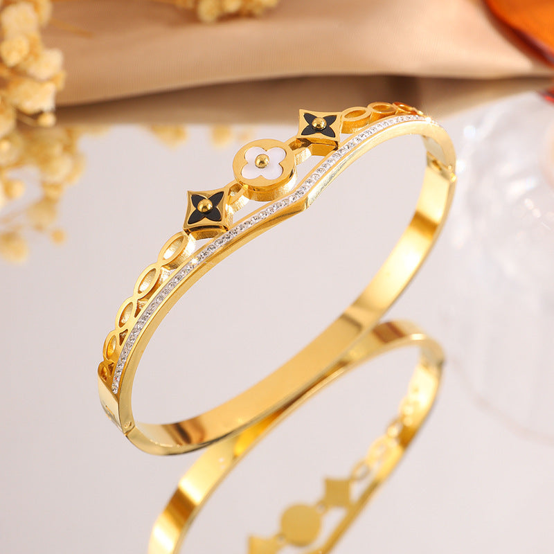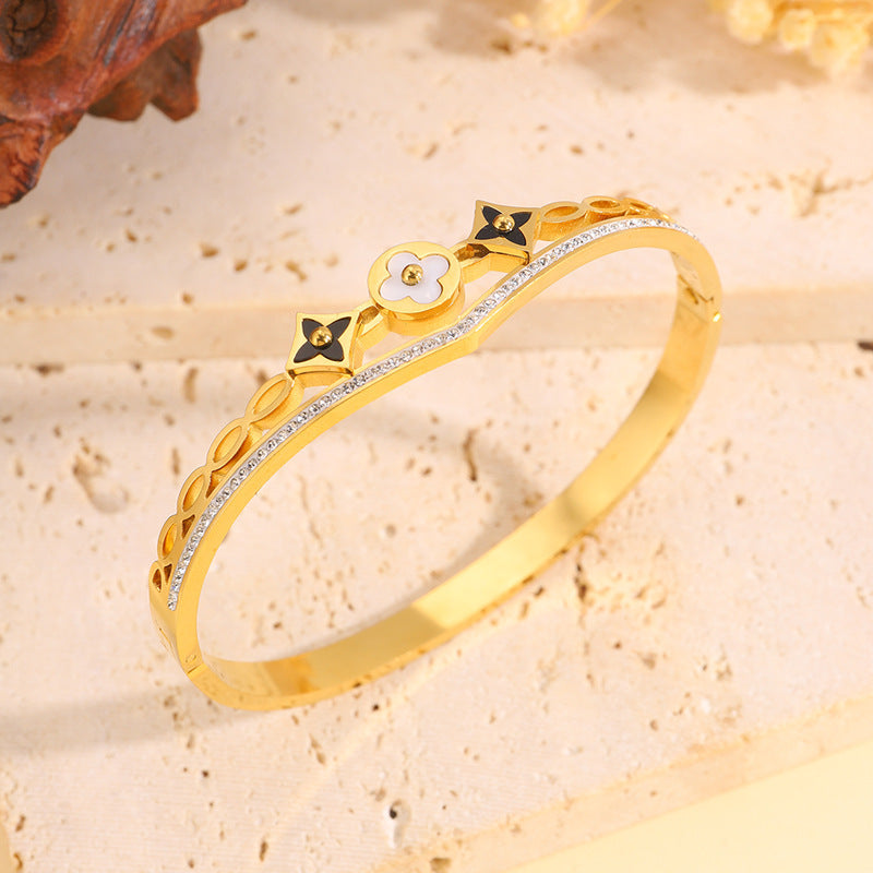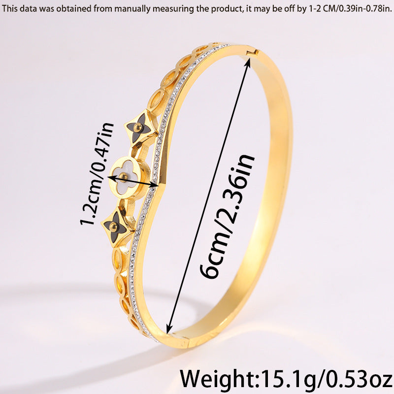 鈦鋼手鐲復古四葉花鑲鑽在逃公主皇冠開口手鐲氣質百搭不褪色飾品