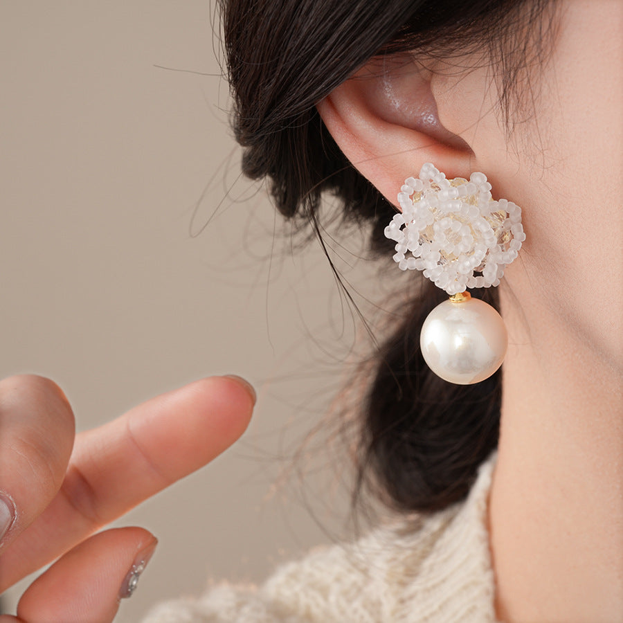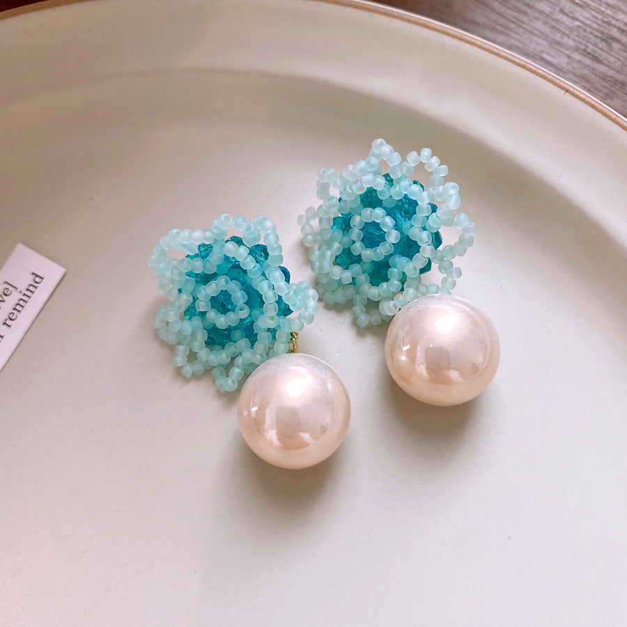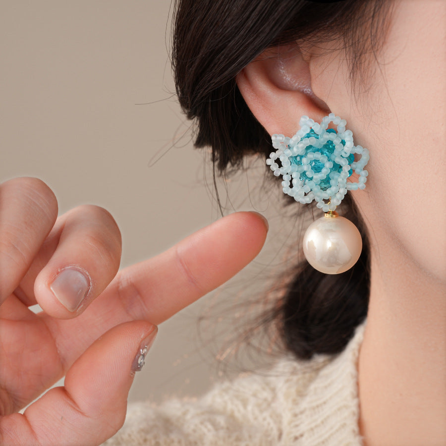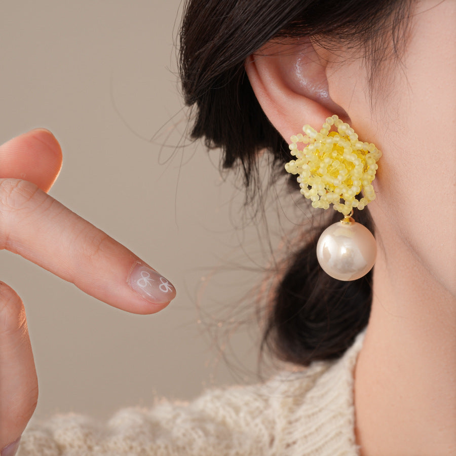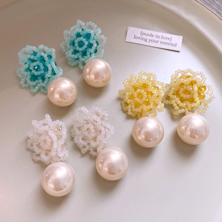 銀針小清新彩色米珠花朵珍珠耳環甜美百搭氣質耳釘輕奢高級感耳飾