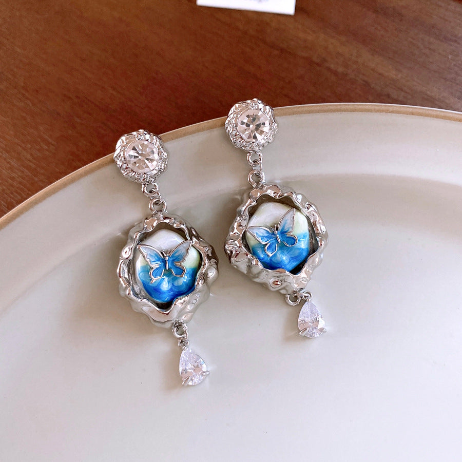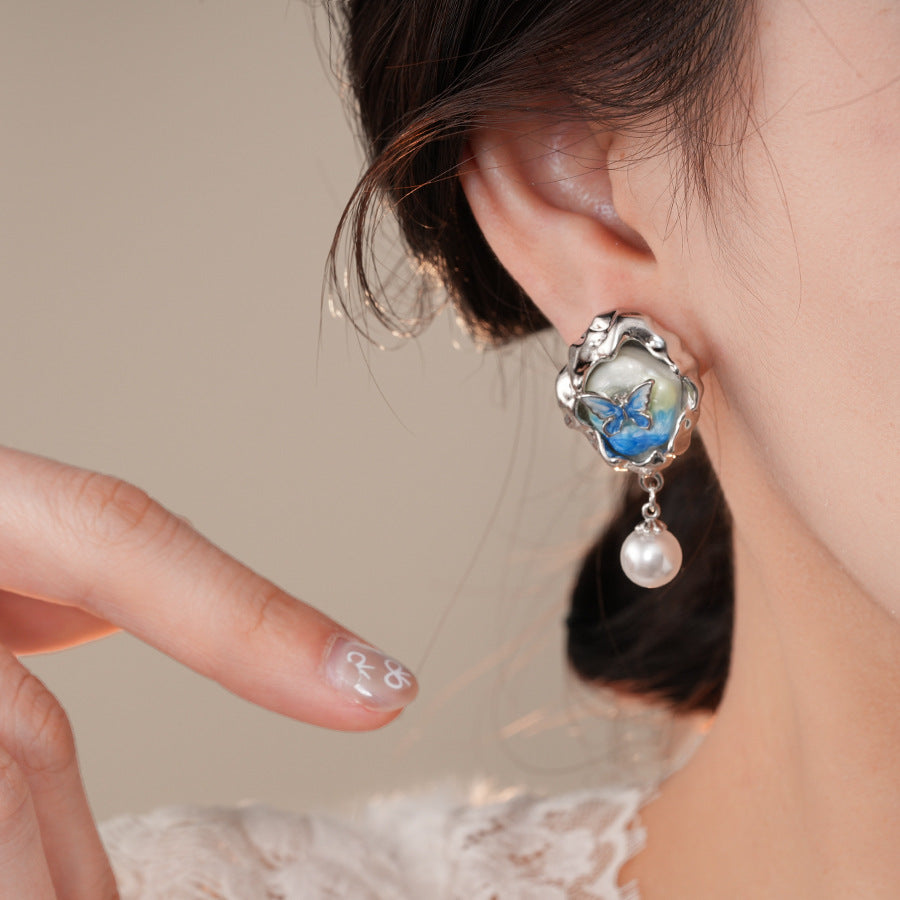 銀針藍色鑲鑽滴油蝴蝶珍珠耳環法式復古油畫風耳釘輕奢高級感耳飾