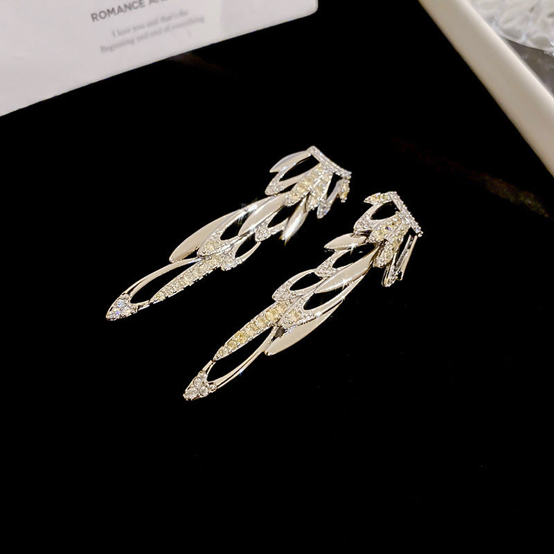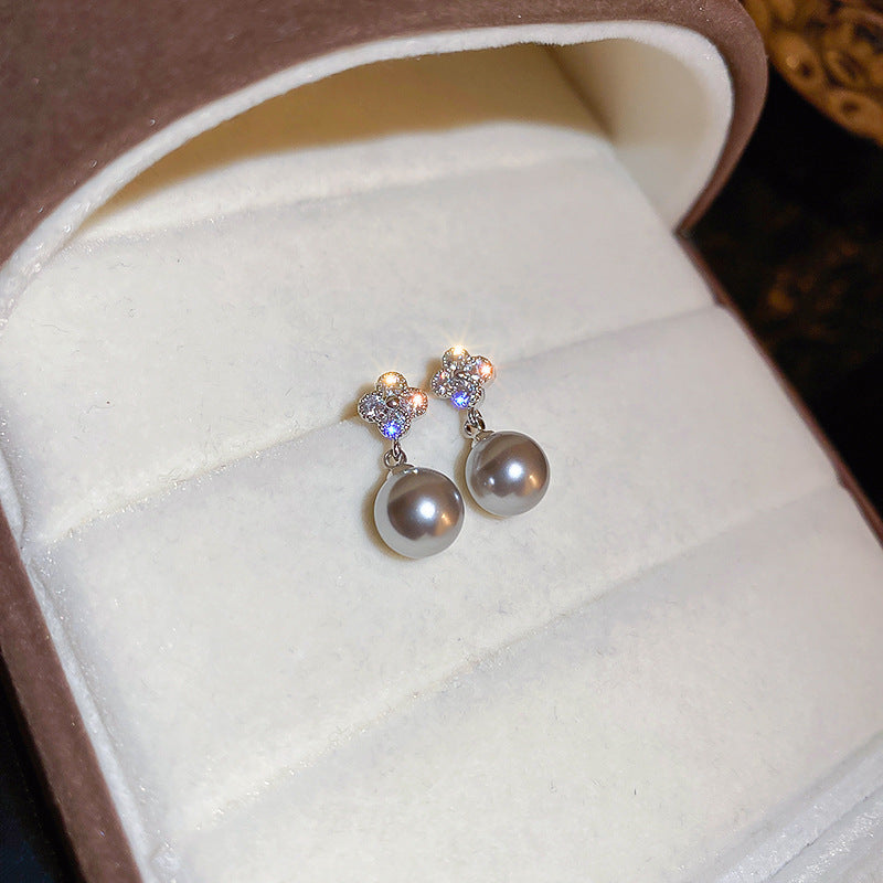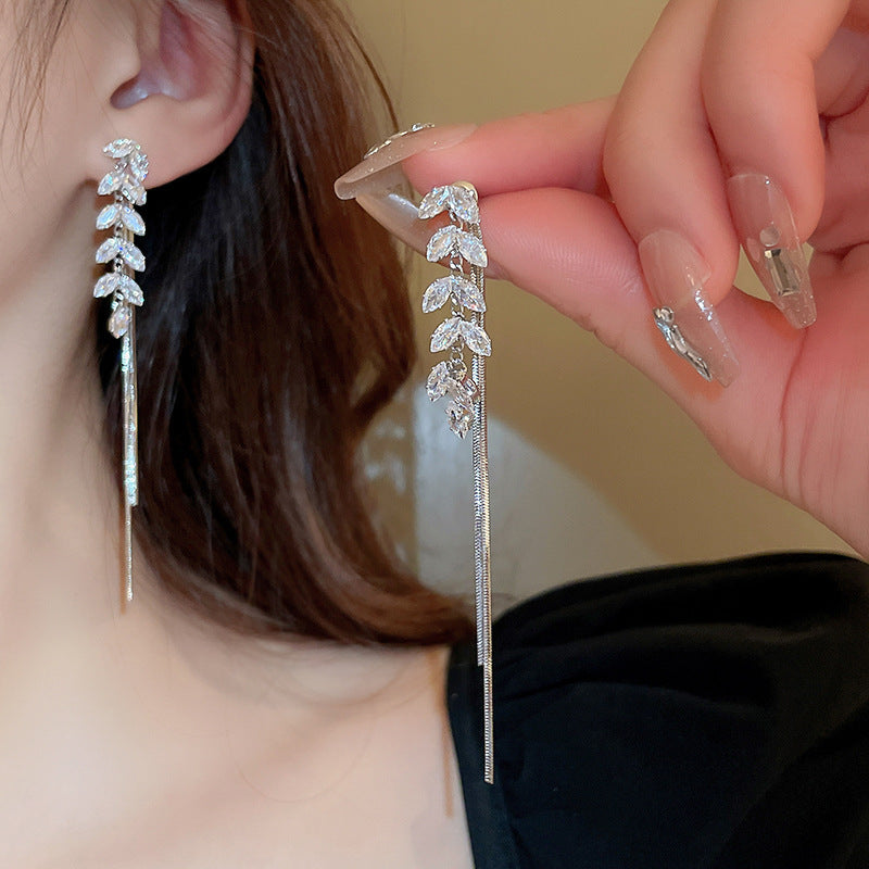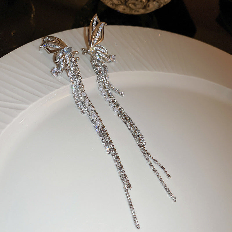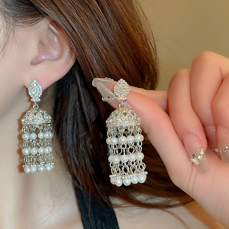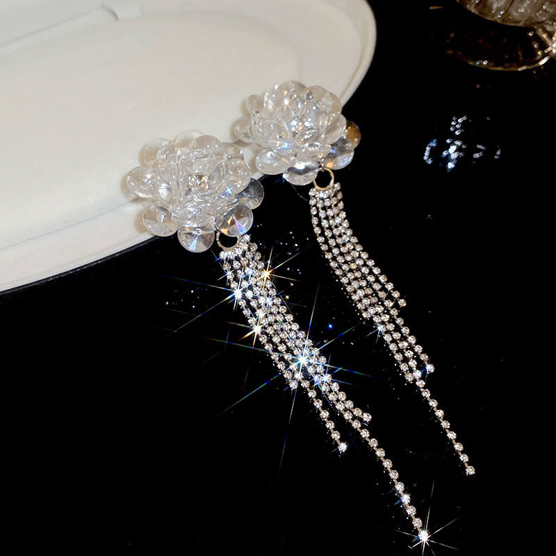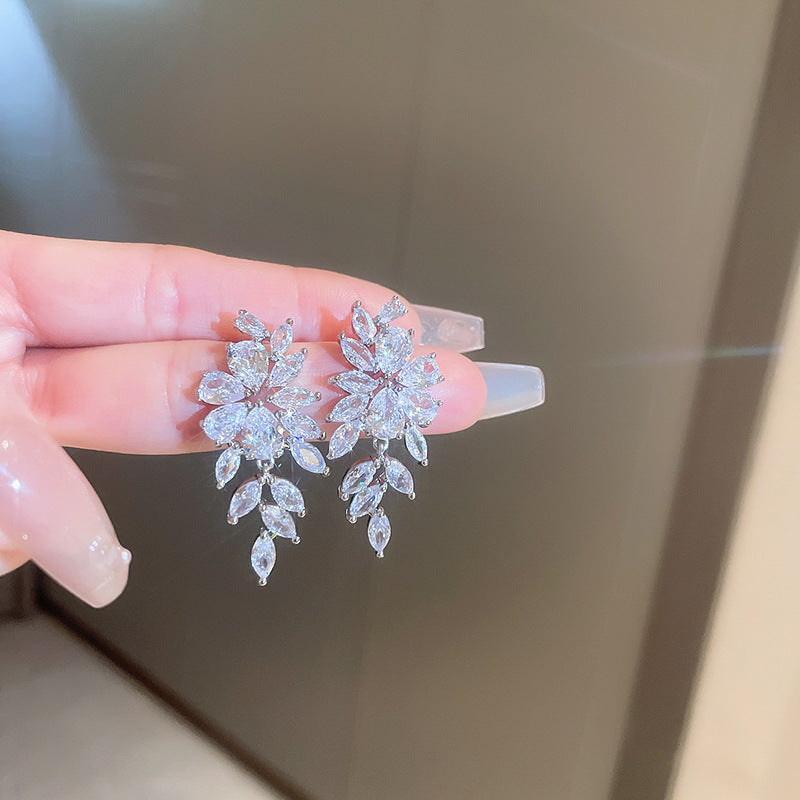 銀針跨境冷淡風銀色鑲鑽鋯石花朵珍珠耳環長款流蘇耳釘高級感耳飾